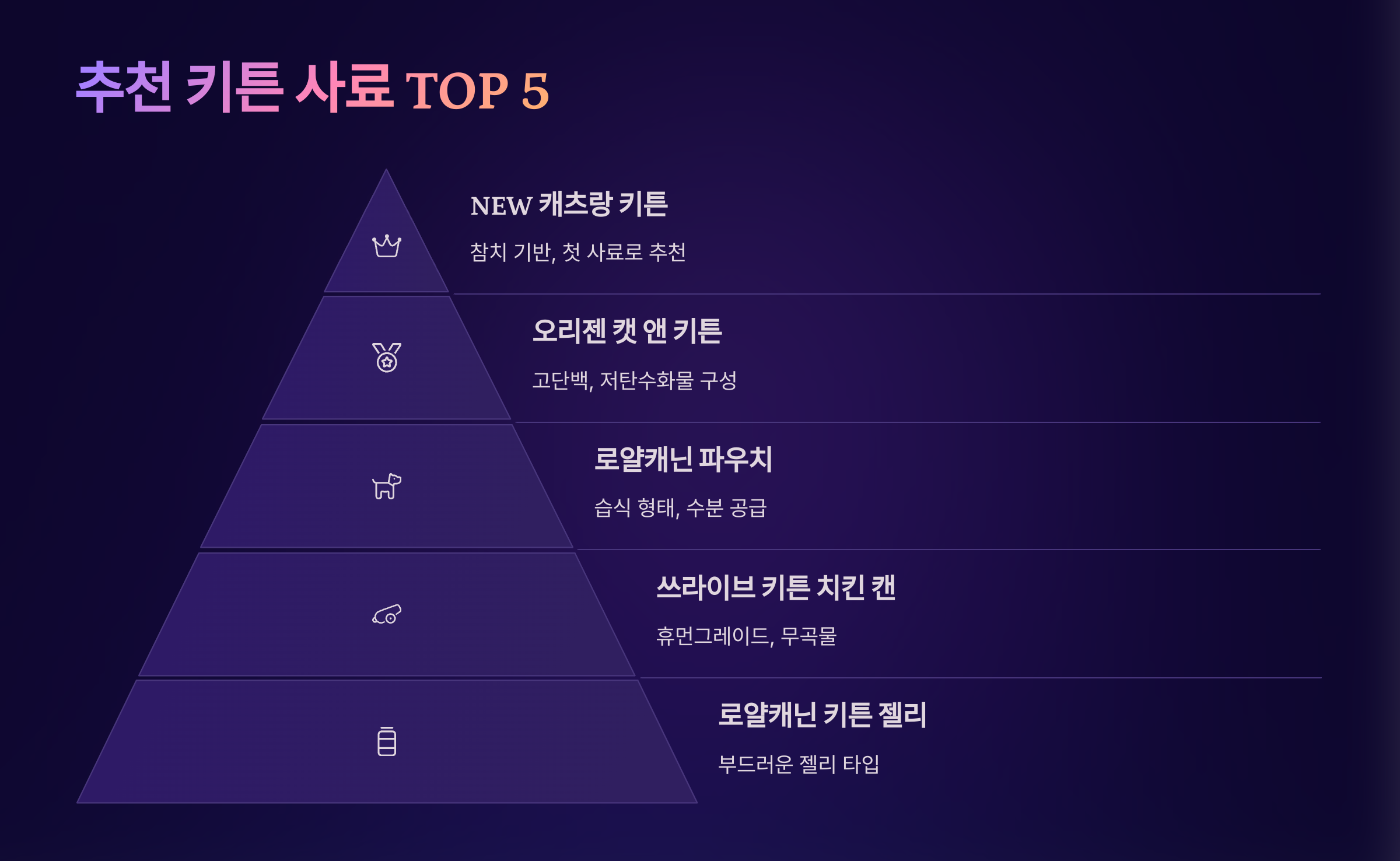 | 로얄캐닌 키튼 파우치 | 수분 풍부, 파우치 습식, 식욕 촉진 | 음수량이 적은 고양이 |