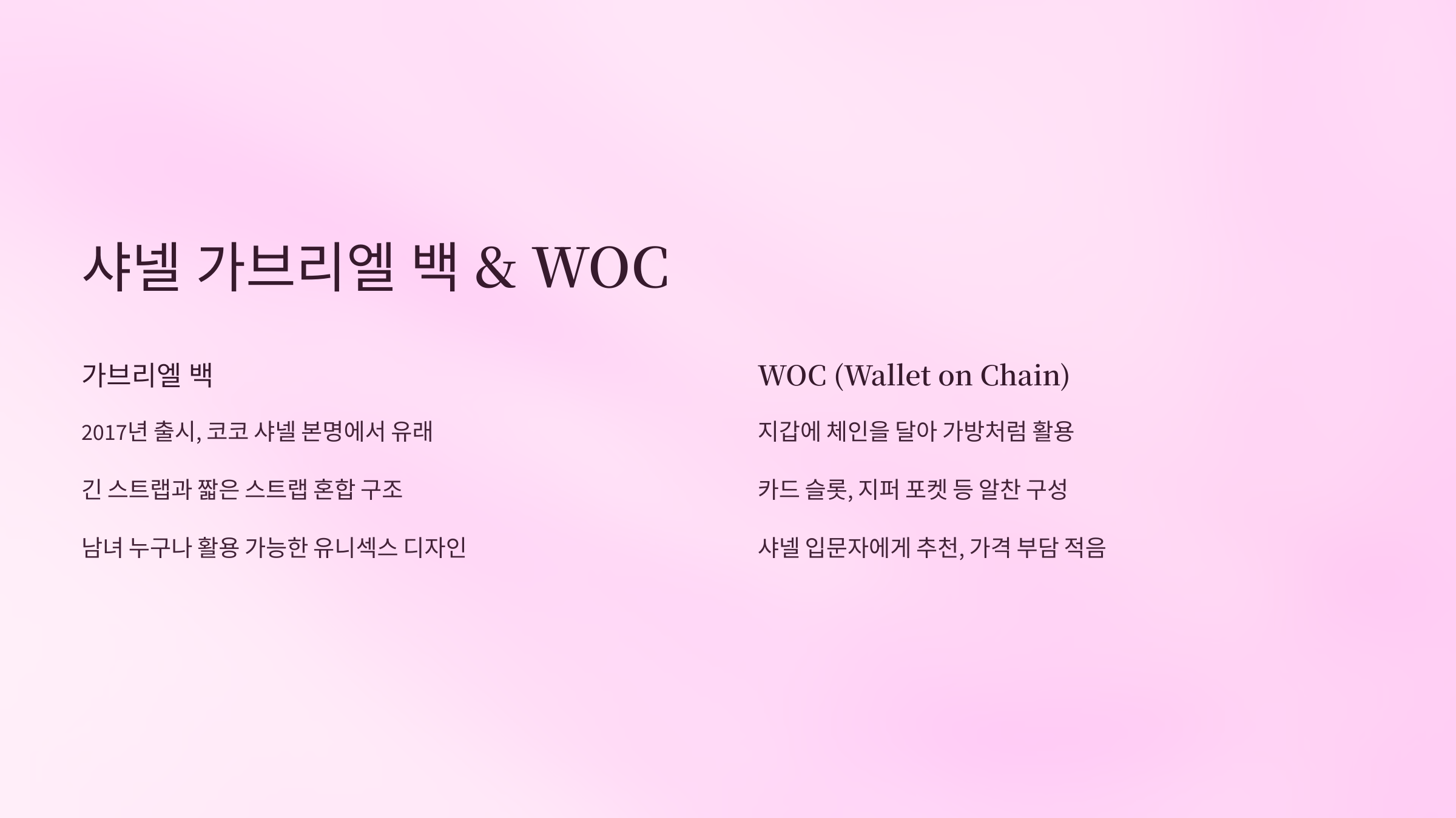 WOC(Wallet on Chain)는 작지만 강력한 실용성을 자랑하는 샤넬의 인기 미니백입니다.