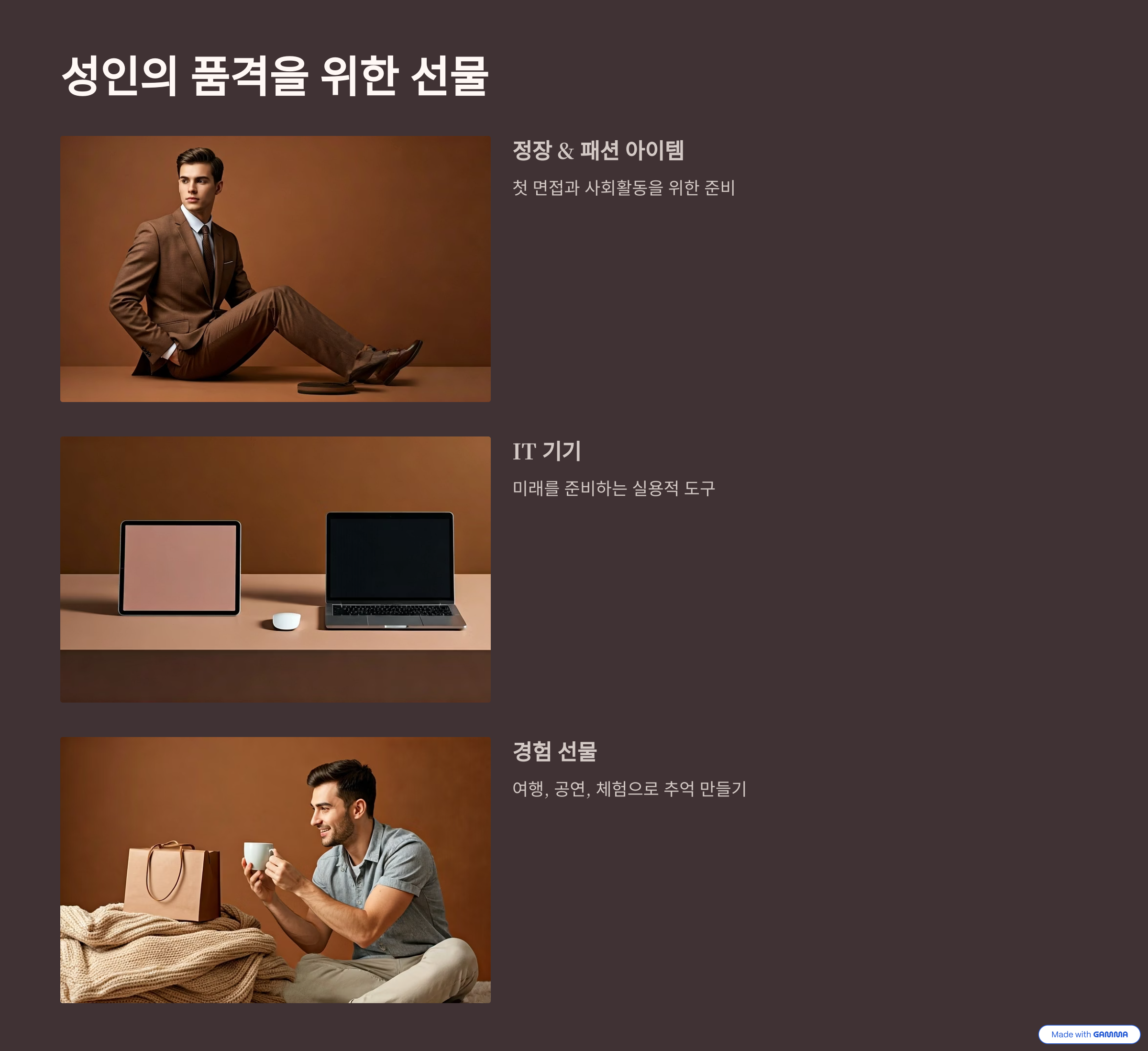 시계는 ‘시간을 소중히 여기며 살아가라’는 메시지를, 지갑은 ‘경제적으로 책임 있는 성인으로 자라라’는 부모님의 응원이 담길 수 있어요.