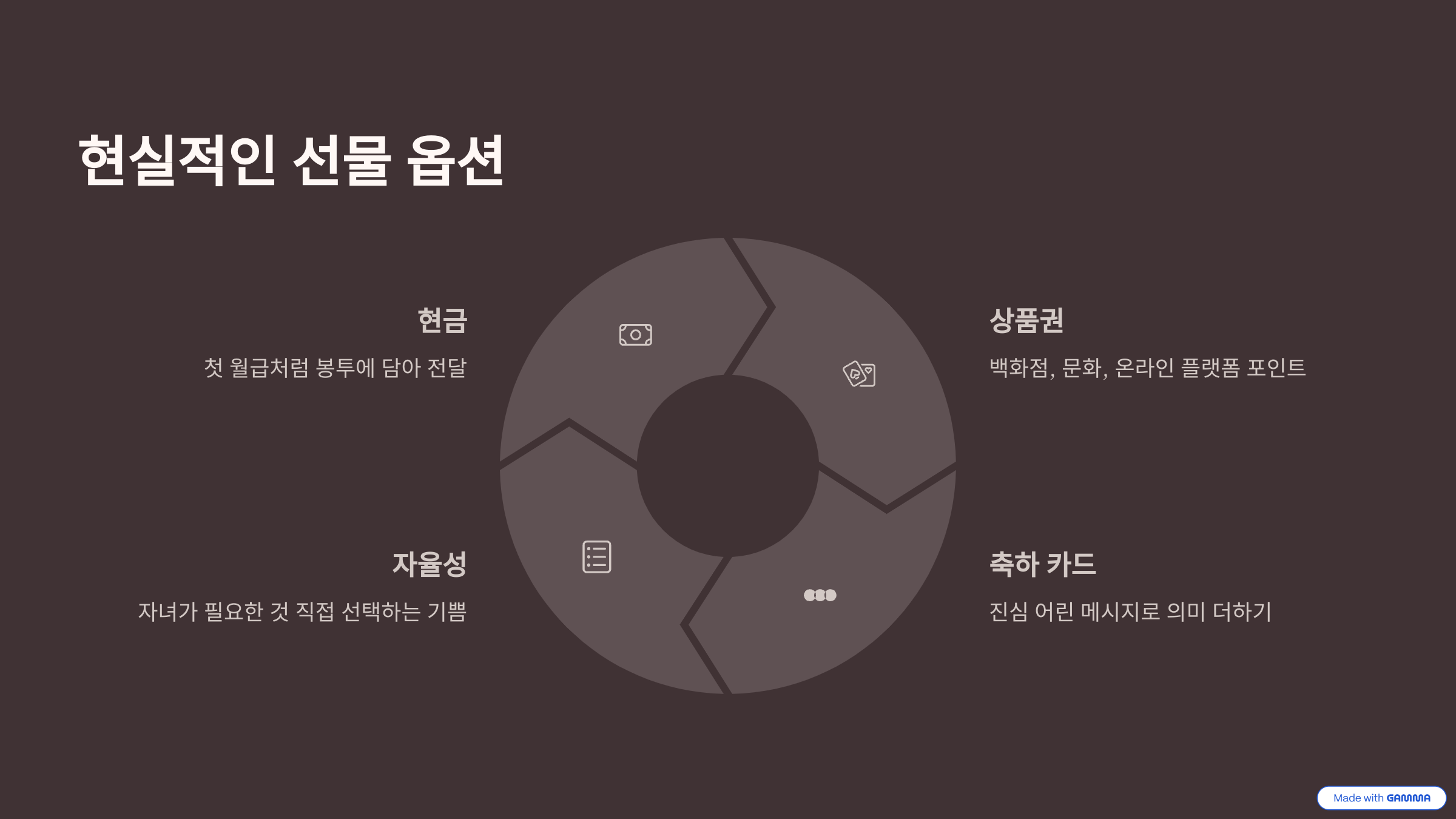 문화상품권, 백화점 상품권, 온라인 플랫폼 포인트 등 자녀가 활용할 수 있는 형태로 맞춰보세요.