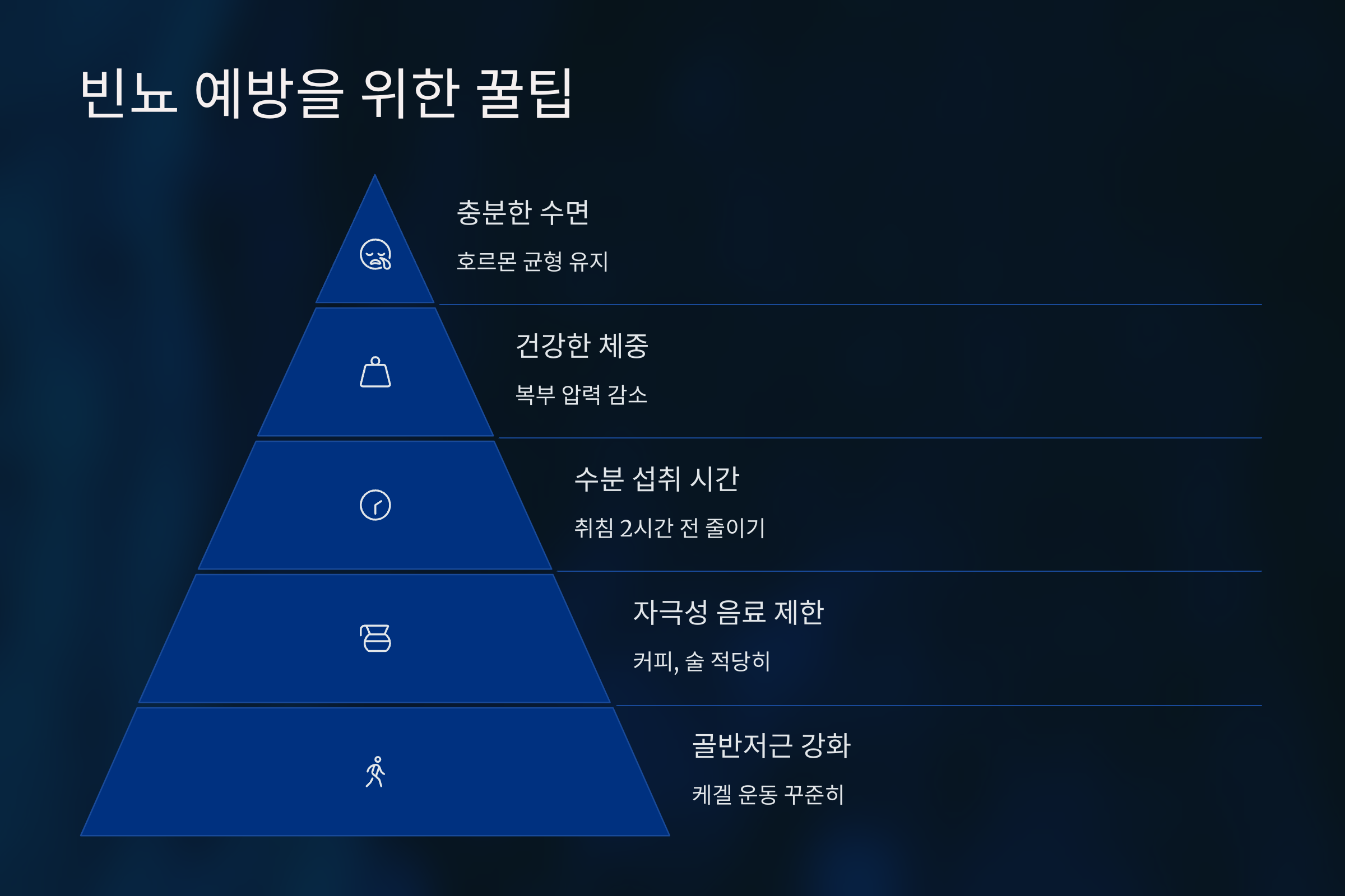 수면이 부족하면 체내 호르몬 균형이 무너져 빈뇨를 악화시킬 수 있어요. 편안한 숙면은 방광 건강에도 필수입니다.