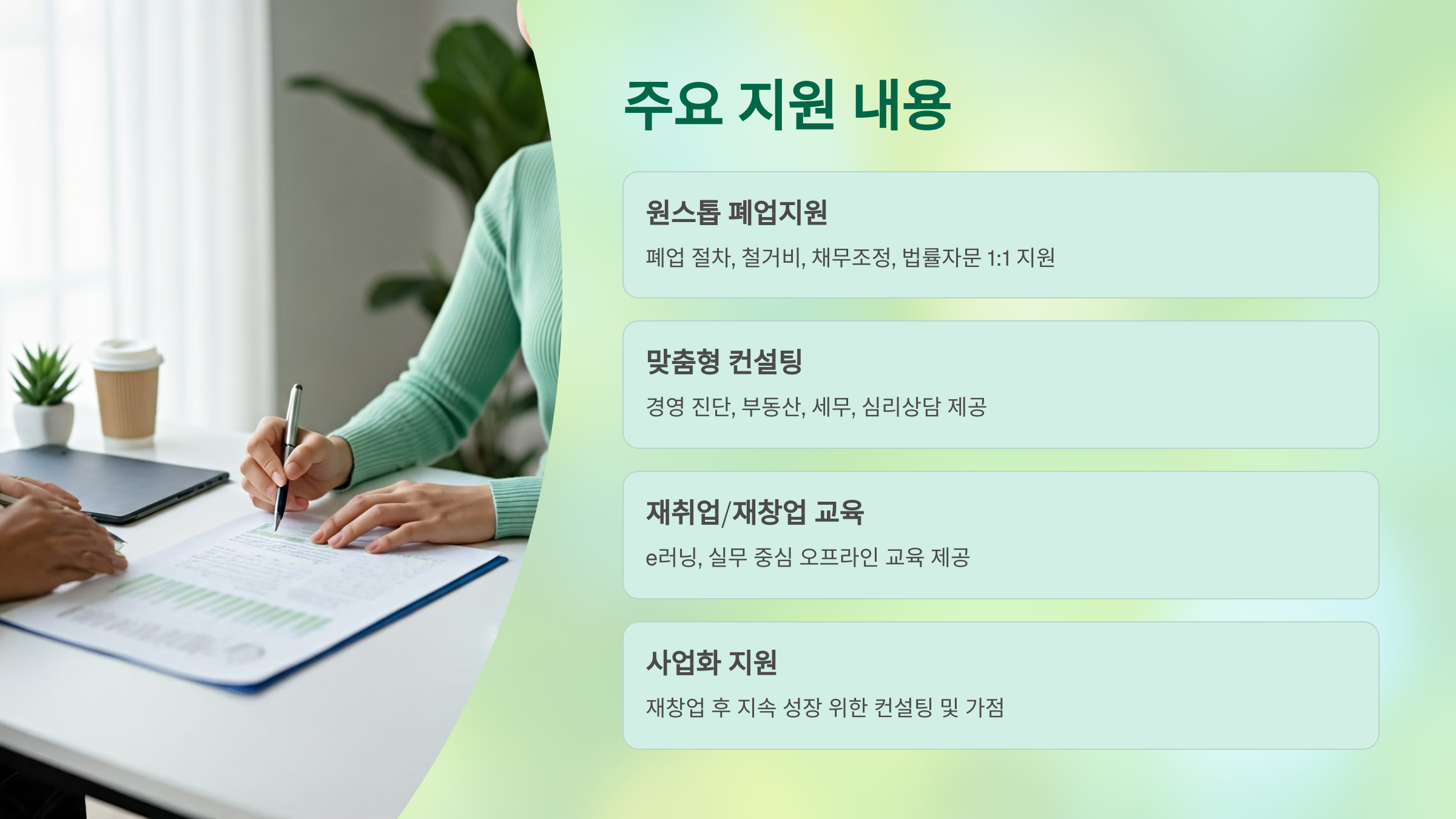 🔖 원스톱 폐업지원: 폐업 절차부터 철거비, 채무조정, 법률자문까지 전 과정을 전문가가 1:1로 도와줍니다.