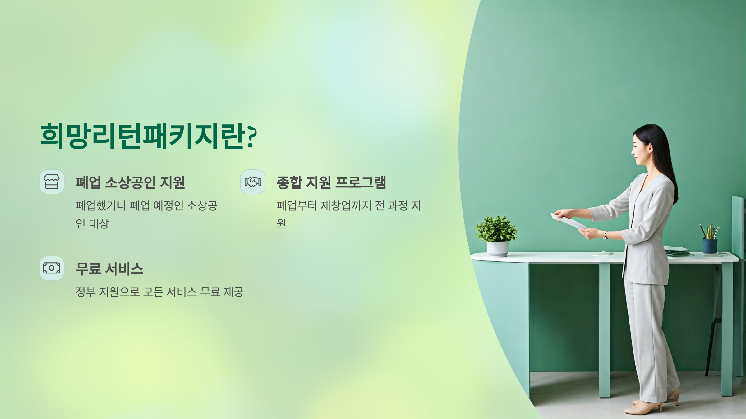 소상공인 희망리턴패키지’는 폐업했거나 폐업을 앞두고 있는 소상공인, 또는 재창업을 준비 중인 분들을 위해 정부에서 제공하는 종합지원 프로그램입니다.