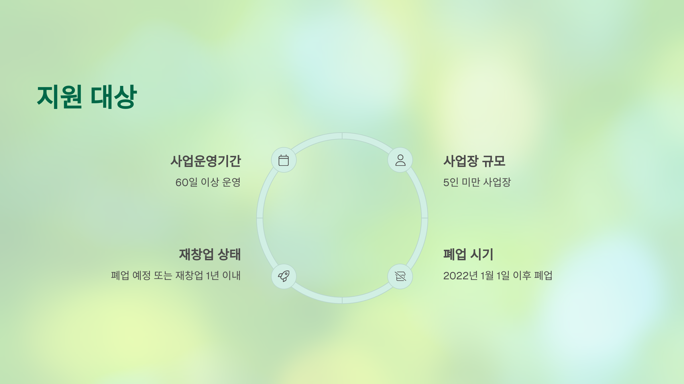 60일 이상 사업을 운영했던 5인 미만 사업장 소상공인 중, 폐업했거나 폐업 예정자, 재창업 1년 이내라면 신청할 수 있어요.