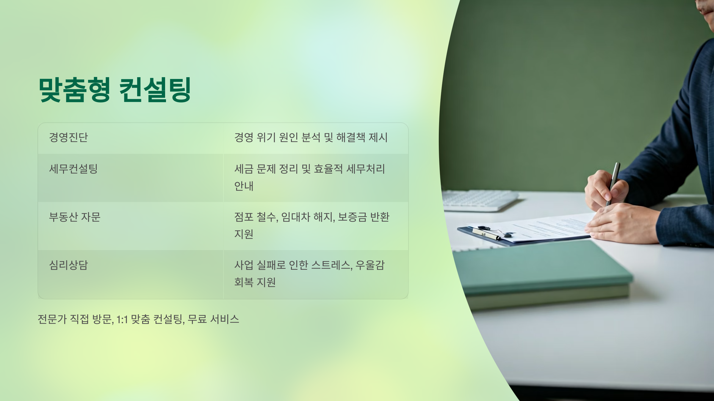 🔖 컨설팅 지원: 경영 악화 원인 진단, 부동산, 세무, 심리상담 등 맞춤형 컨설팅 제공