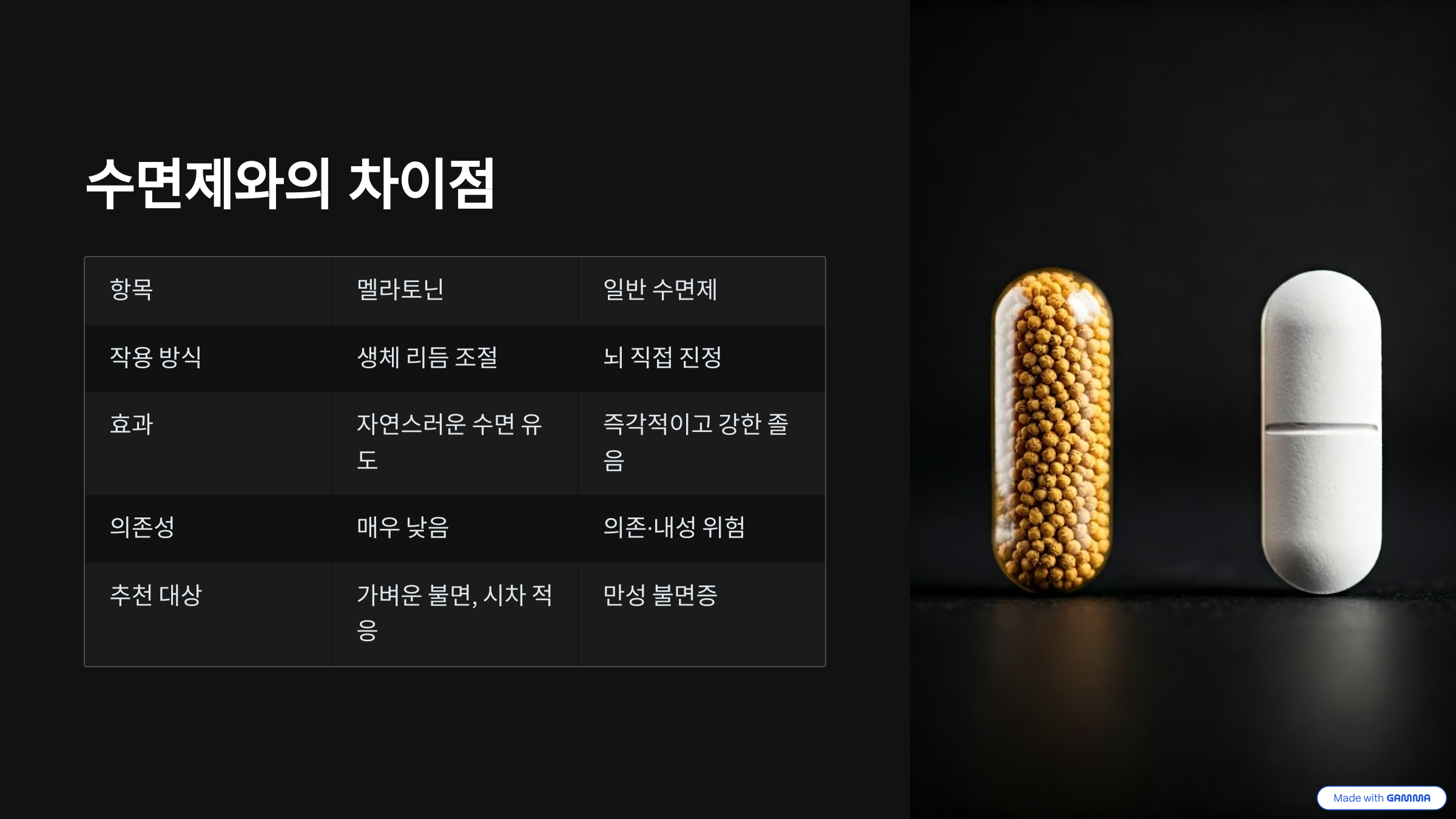"멜라토닌은 수면을 '강제로 유도'하는 것이 아니라, 몸이 자연스럽게 잠들도록 환경을 만들어주는 역할을 합니다."