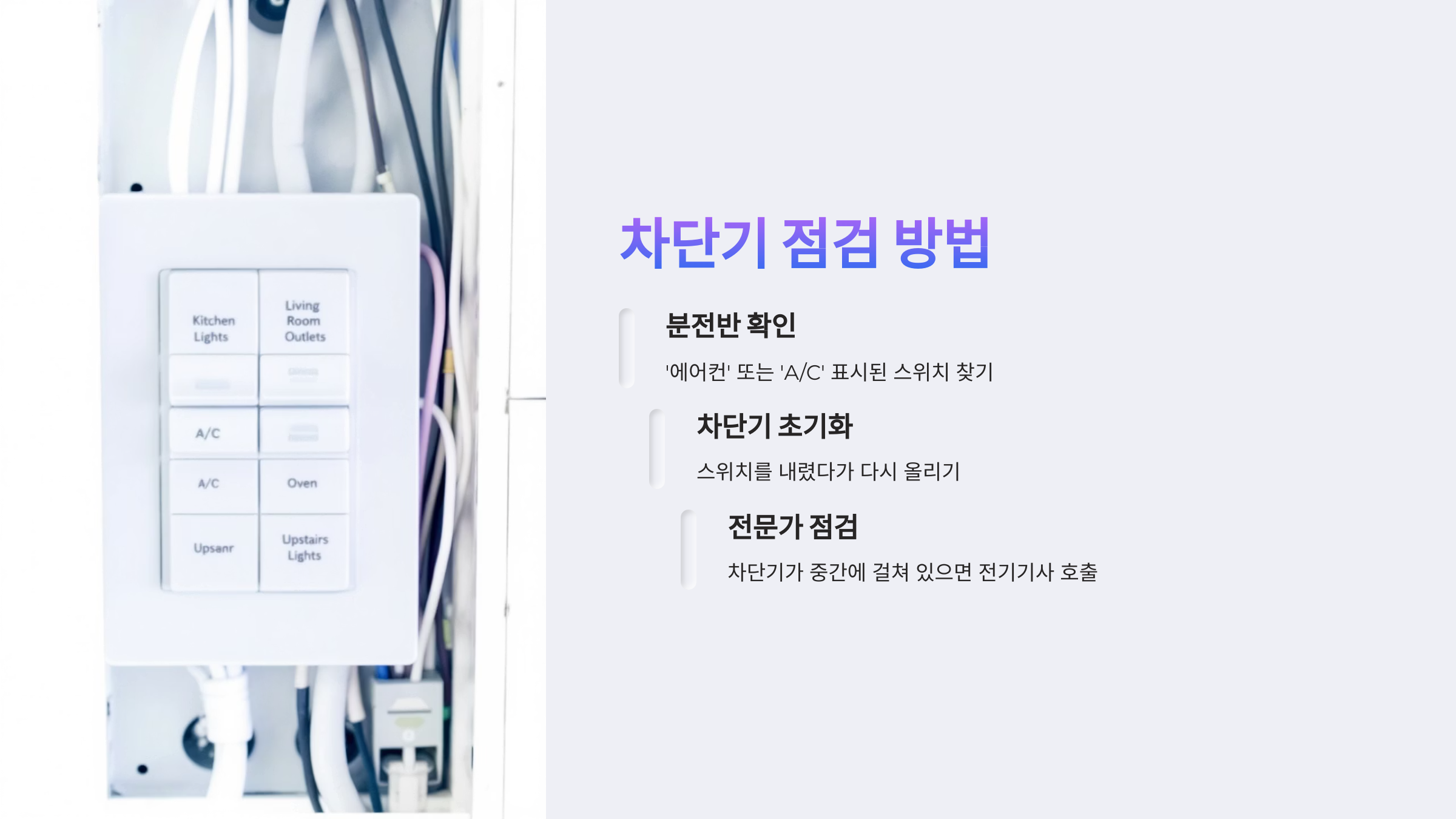 분전반에서 '에어컨' 또는 'A/C'라고 표시된 스위치를 내려두었다가 다시 올려주는 것만으로 문제를 해결할 수 있습니다.