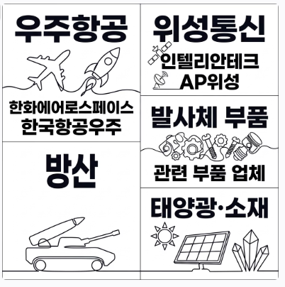 | 투자 포인트 | 발사체, 위성통신, 방산, 태양광·소재 등 실제 연결 고리를 나눠서 봐야 합니다. |
