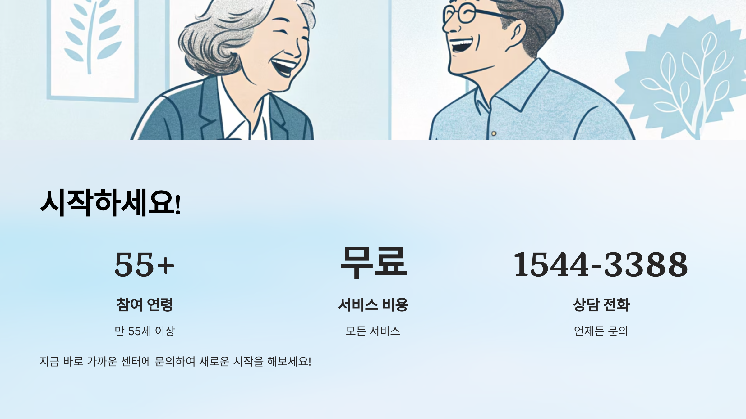 | 노인일자리 상담 대표전화 | 1544-3388 | 지역별 수행기관 자동 연결 |