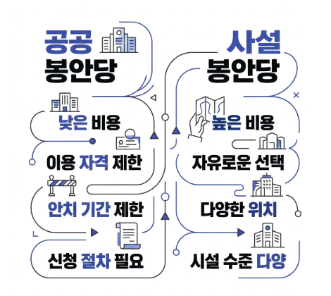 공공 봉안당은 비용 면에서 유리한 경우가 많습니다. 반면 사설 봉안당은 시설 선택 폭이 넓고 위치가 다양한 대신 비용이 크게 올라갈 수 있습니다.