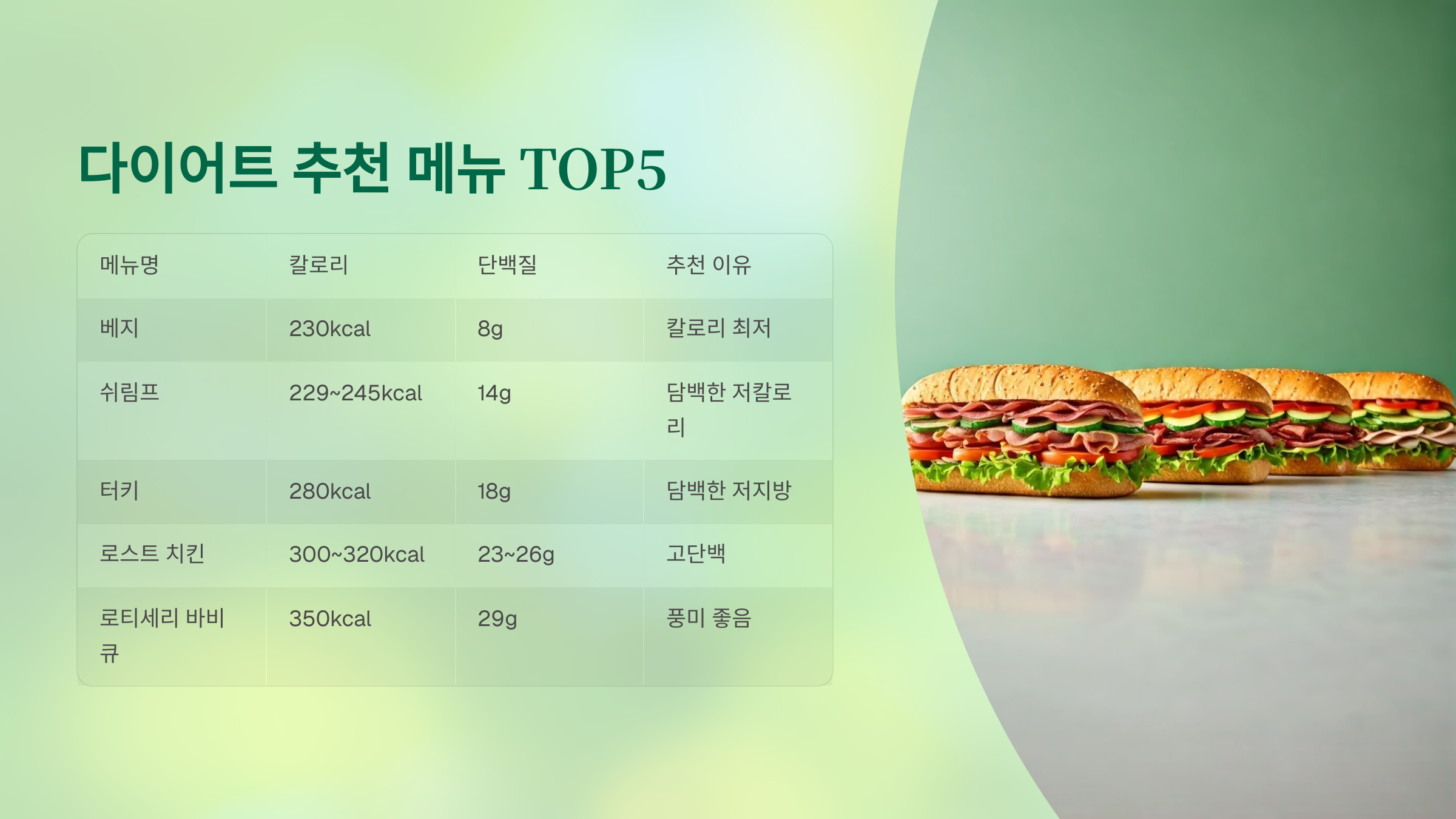 오늘은 써브웨이를 활용한 다이어트 꿀조합부터, 칼로리 낮고 포만감 높은 메뉴까지