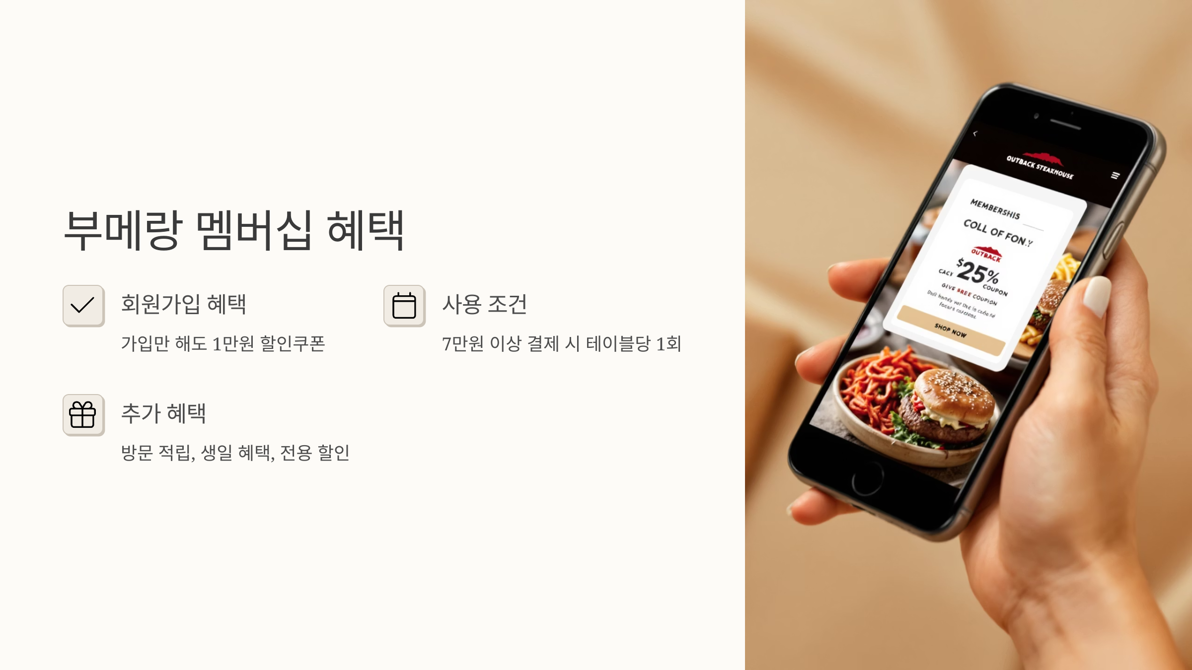 가입은 공식 홈페이지, 아웃백 앱, 키오스크에서 모두 가능하니 빠르게 가입하고 혜택 챙기세요!