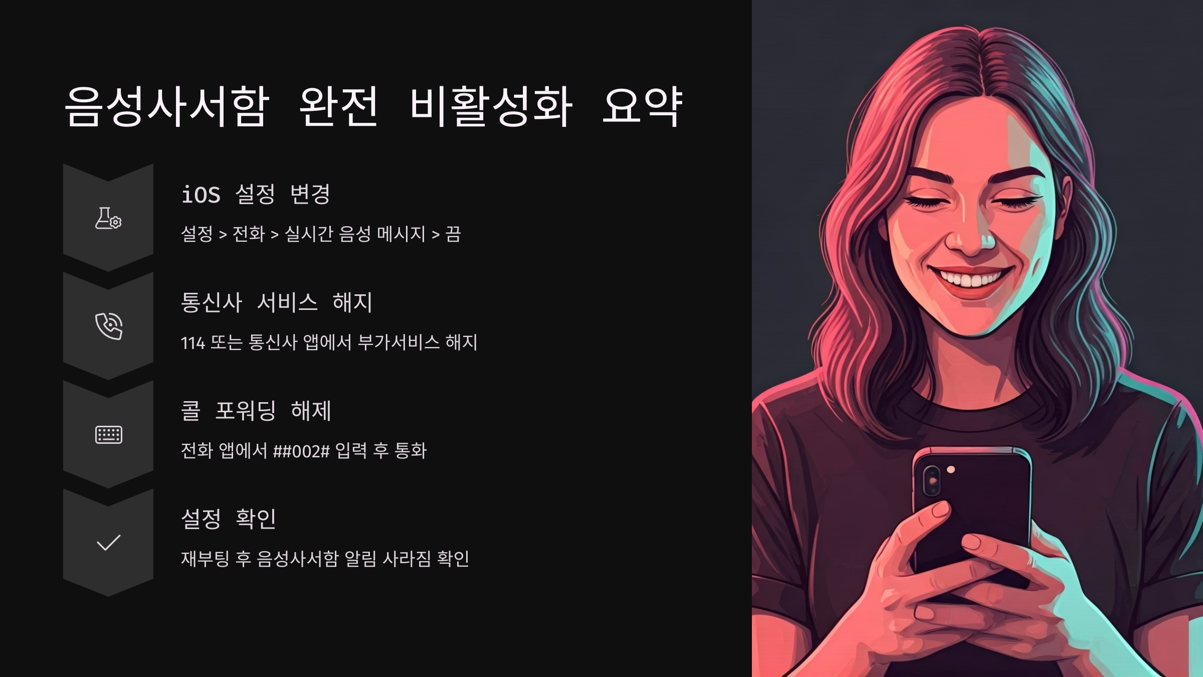 음성사서함 기능은 iOS나 통신사 시스템상 완전 삭제는 어렵지만, 위 방법들로 사실상 완전한 비활성화가 가능합니다.