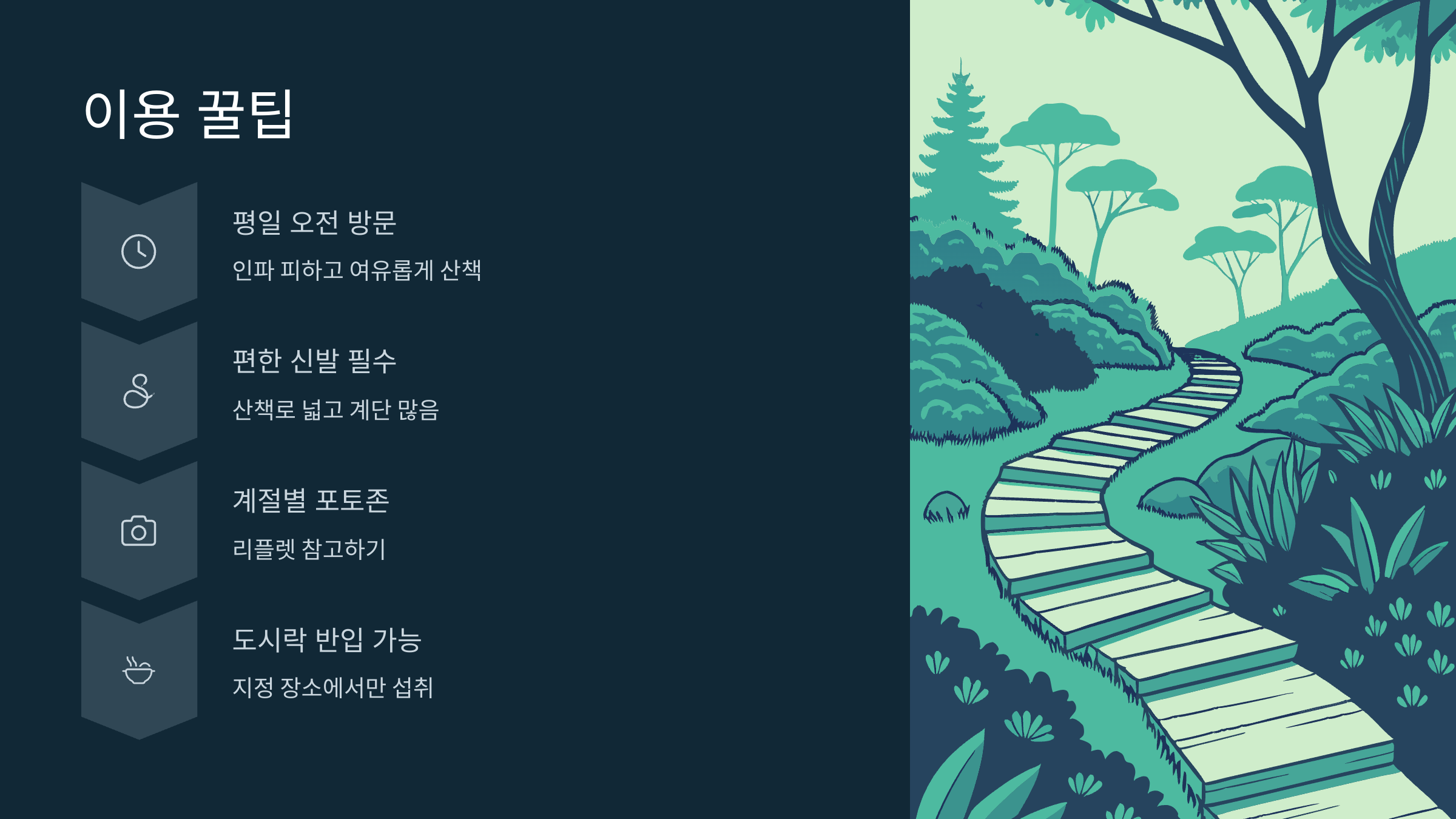 - 2. 편한 신발 필수: 산책로가 넓고 계단이 많기 때문에 운동화 착용은 필수입니다.