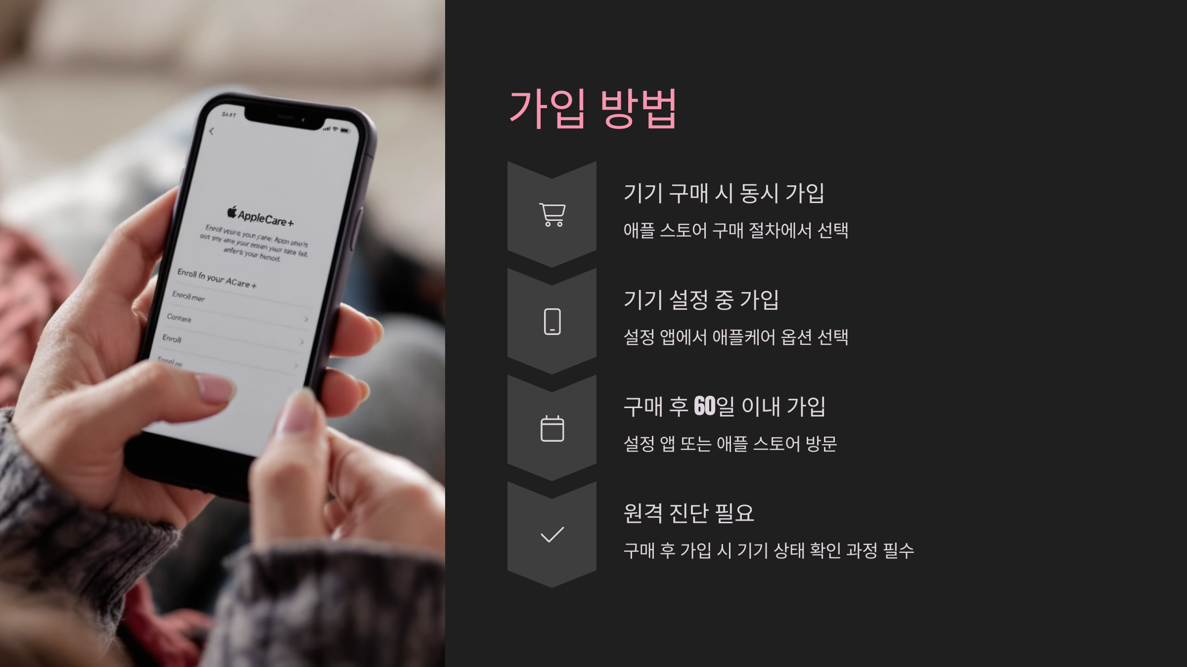 애플케어 플러스는 구입 시 바로 가입하거나, 구매 후 60일 이내에만 가입할 수 있어요.