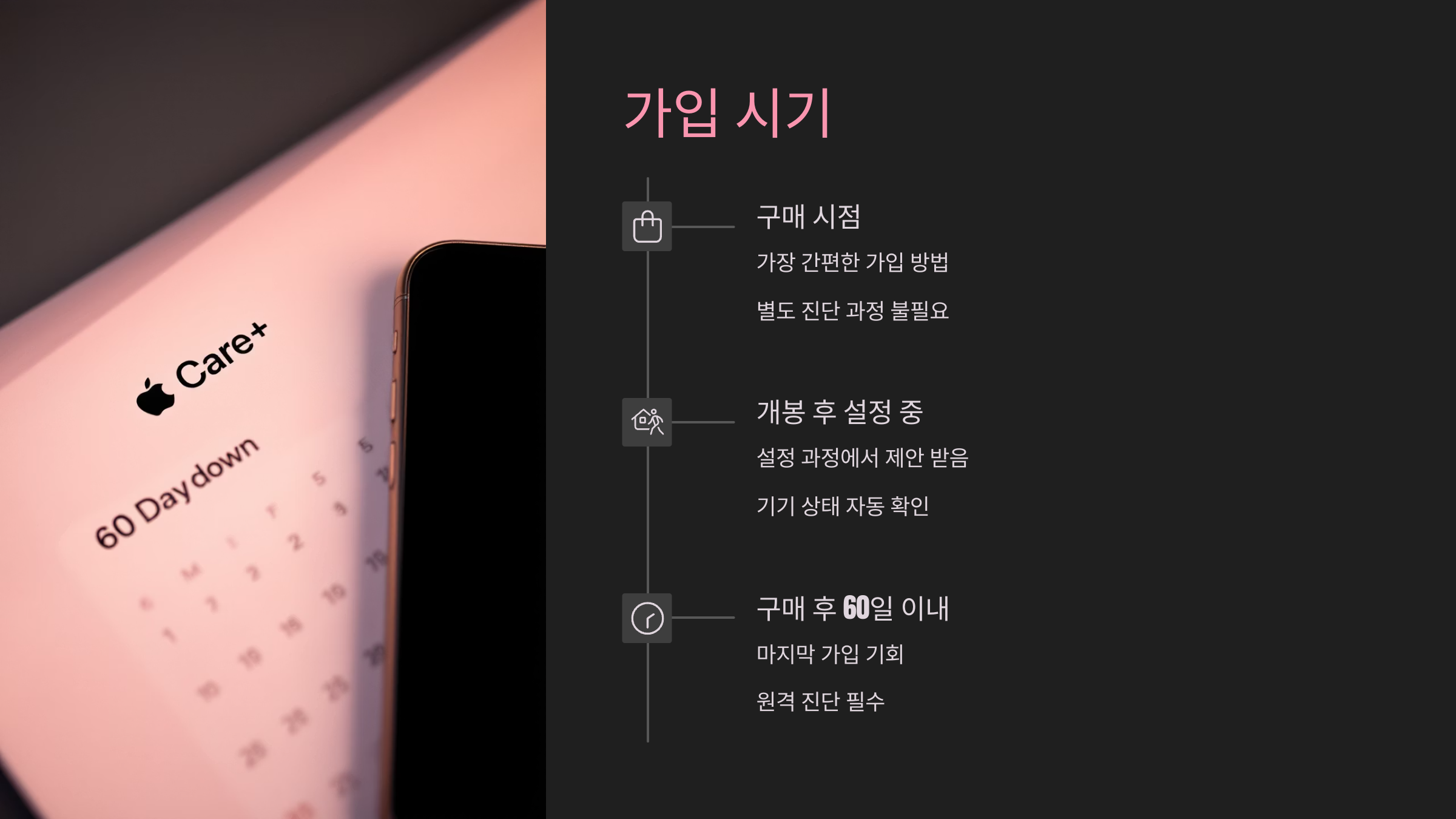애플케어 플러스는 기기 구매 시점 또는 구매 후 60일 이내에만 가입이 가능해요.