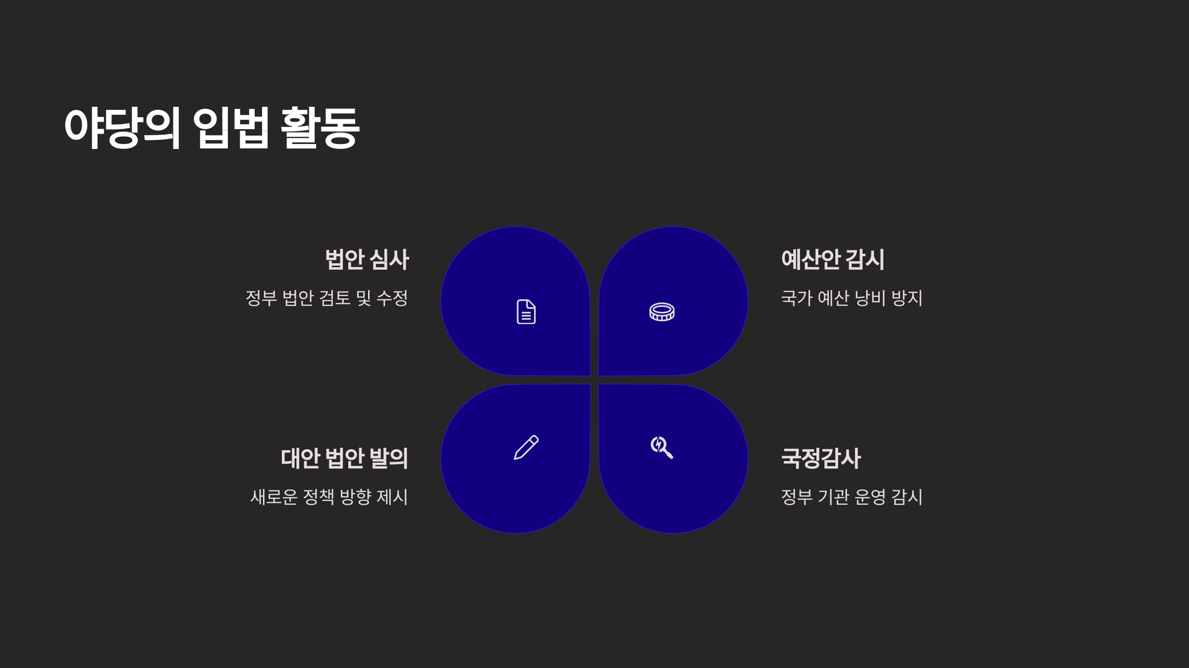 다음은 최근 몇 년 간 야당이 중심이 되어 이루어진 대표적인 활동 사례들이에요.