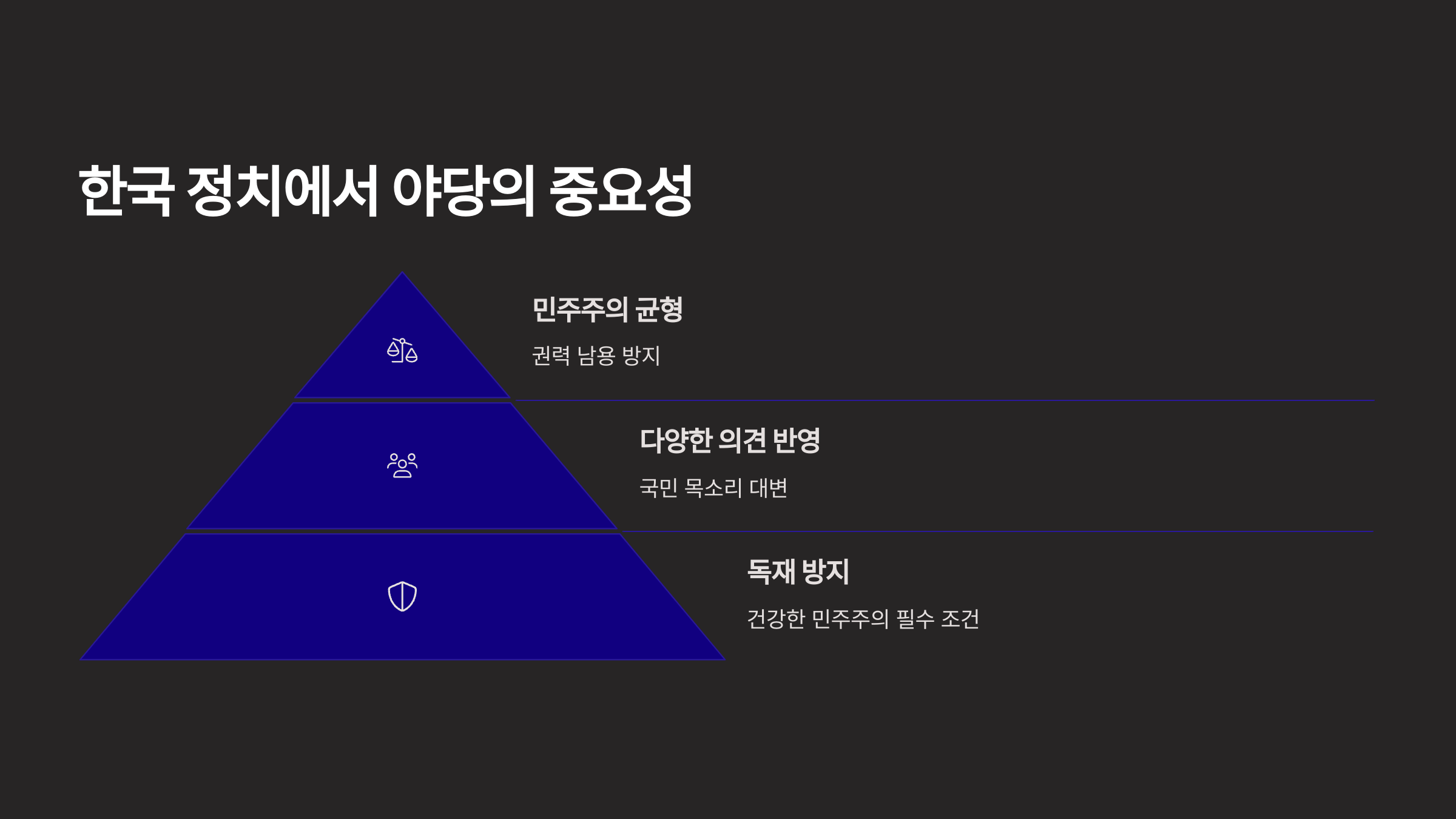 한국 정치에서도 야당은 단순한 반대파가 아니라 균형과 견제의 축입니다.