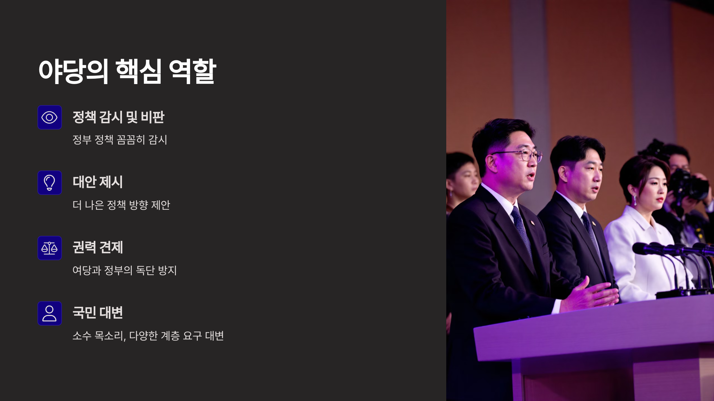 특히 야당은 단순히 반대만 하는 존재가 아니라, 민주주의를 지키는 핵심적인 역할을 담당하고 있어요.