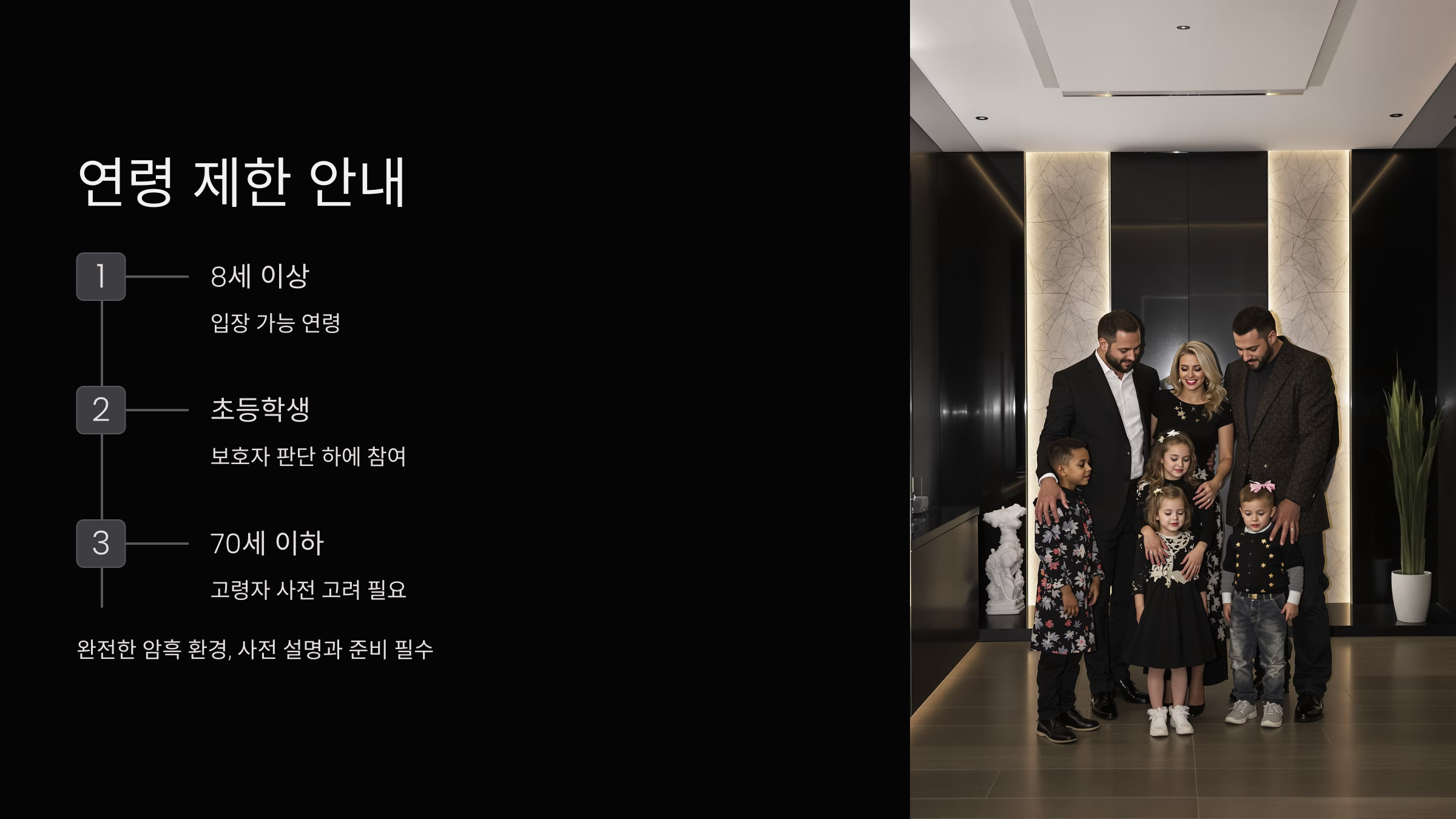 - 노약자 및 고령자의 경우, 어둠 속 환경이 부담될 수 있으므로 사전 고려 필요