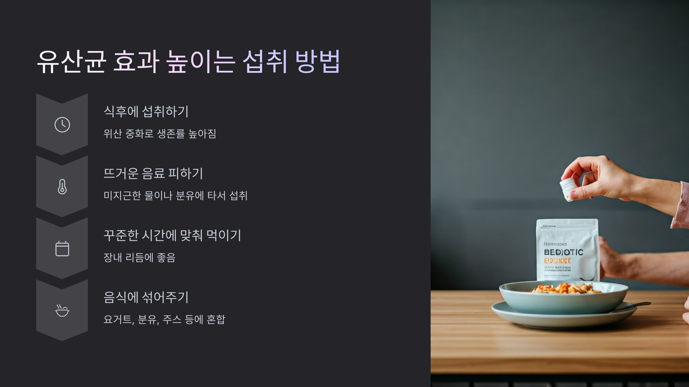 💡 TIP: 유산균은 일정한 시간에, 일정량을 꾸준히 섭취하는 것이 가장 중요합니다.