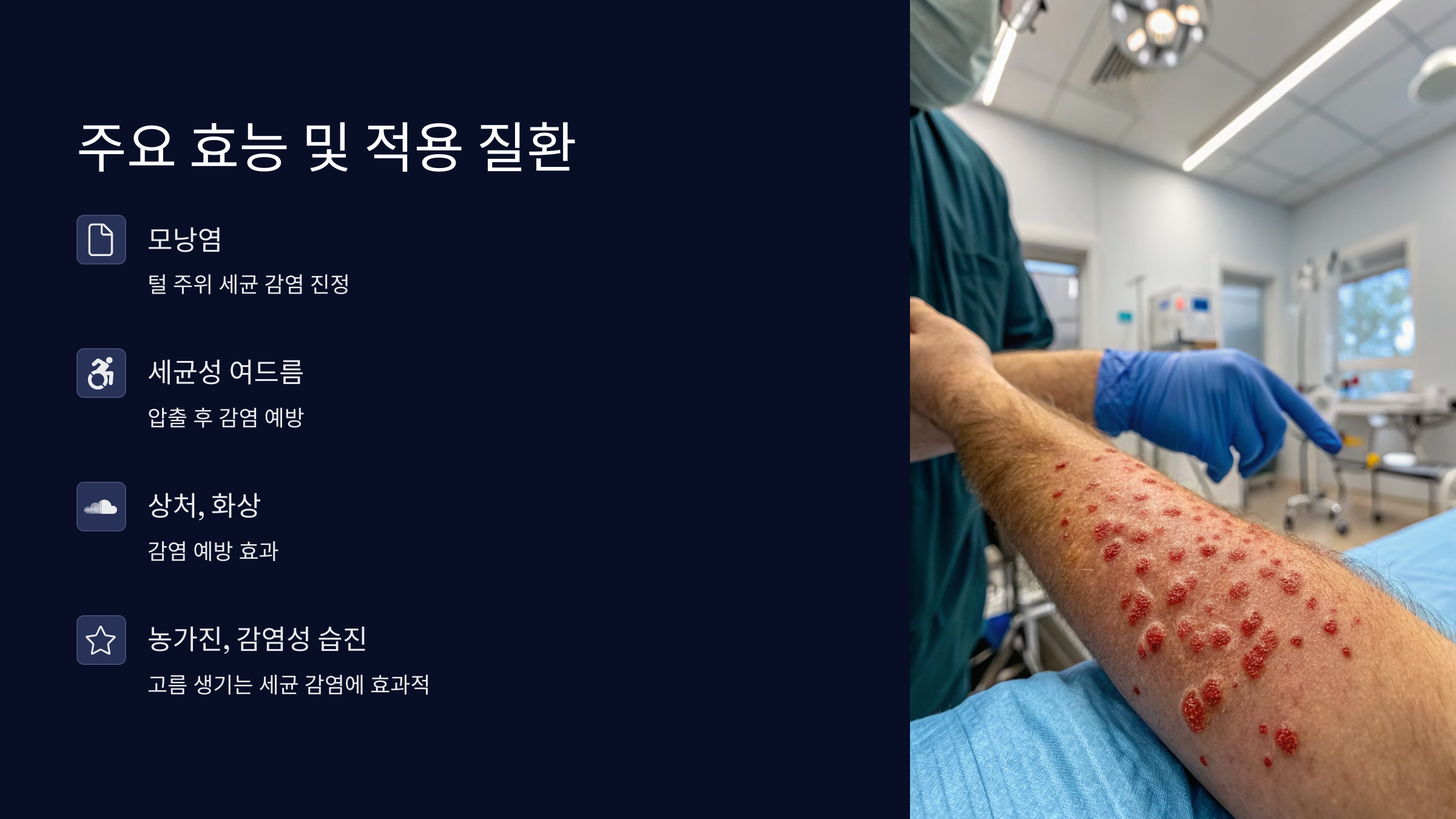 🔖 체크포인트 4: 농가진(고름딱지)·감염성 습진 – 고름이 생기고 껍질이 덮이는 세균 감염성 질환에 효과적이에요.
