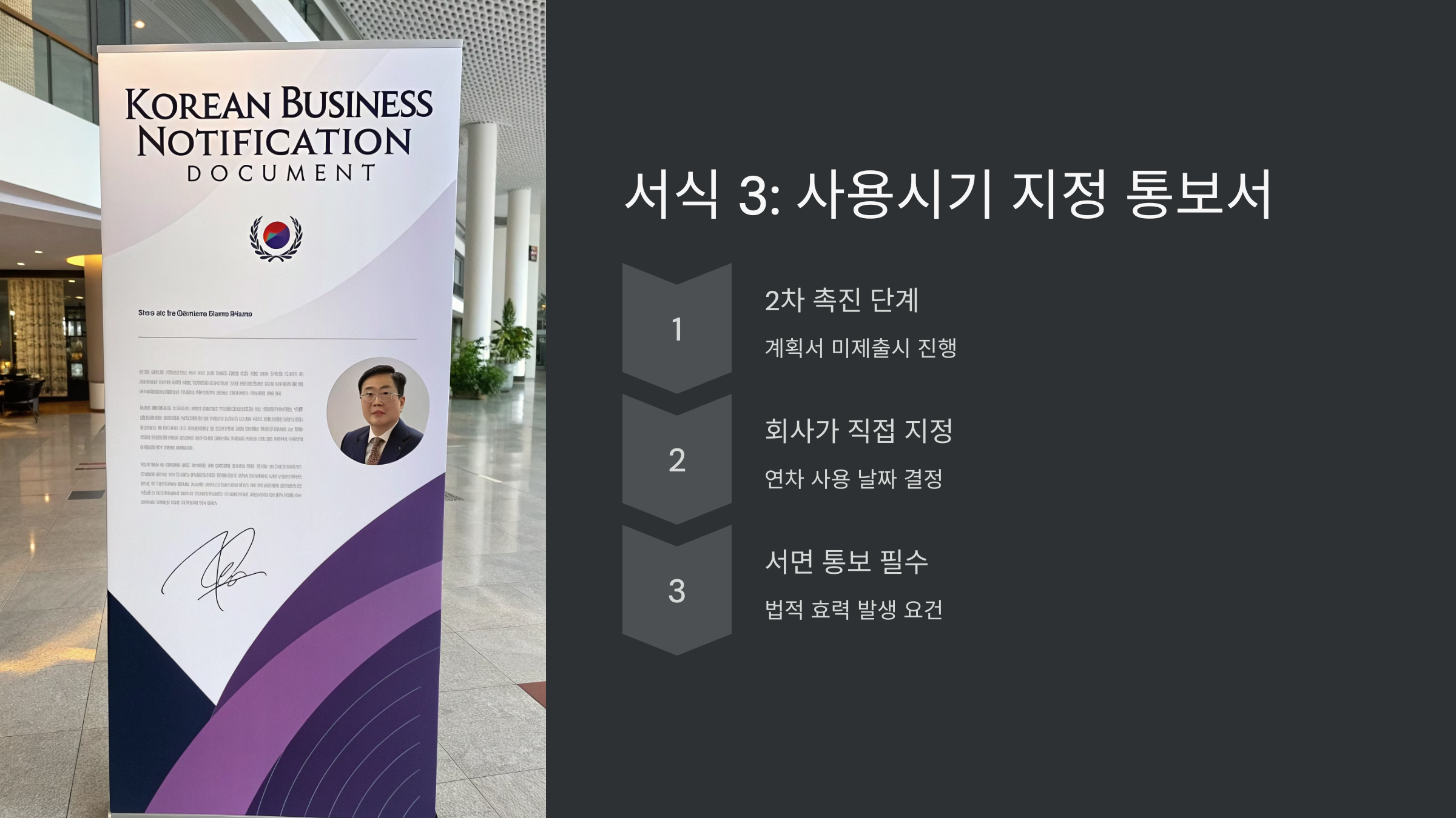 통보서에는 사용자가 정한 날짜가 명시되어야 하고, 이를 서면으로 전달해야 해요.