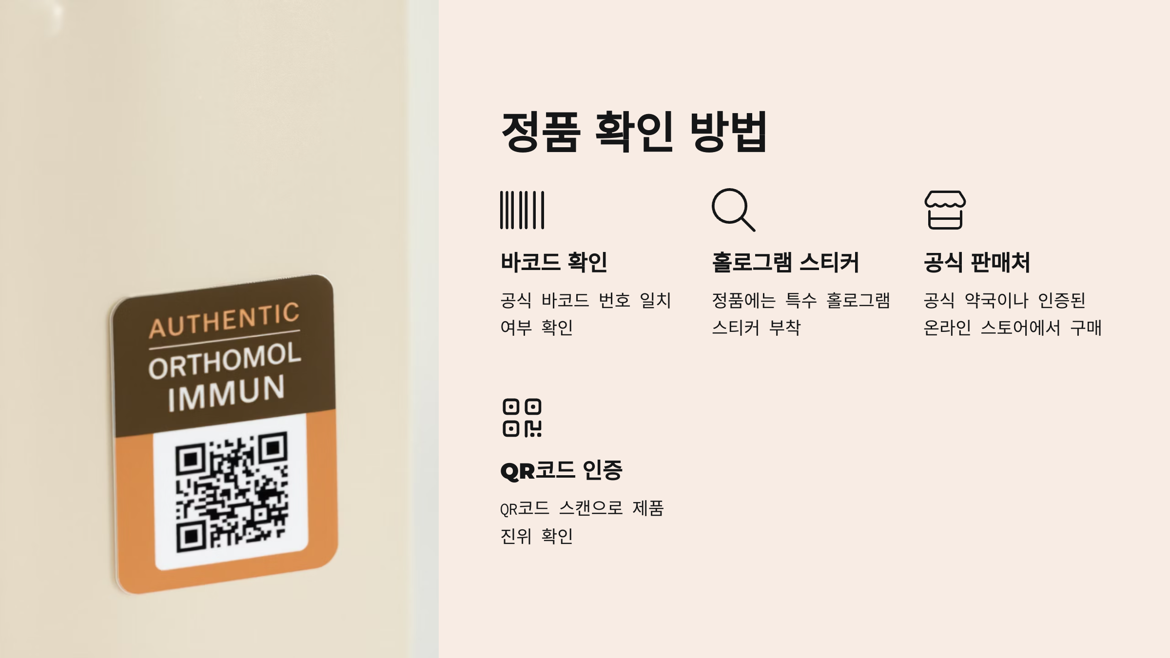 제품 포장에 있는 한글 스티커, 수입사 정보, 바코드, 정제 색상 등을 확인하세요. 공식몰에서의 구매도 방법입니다.