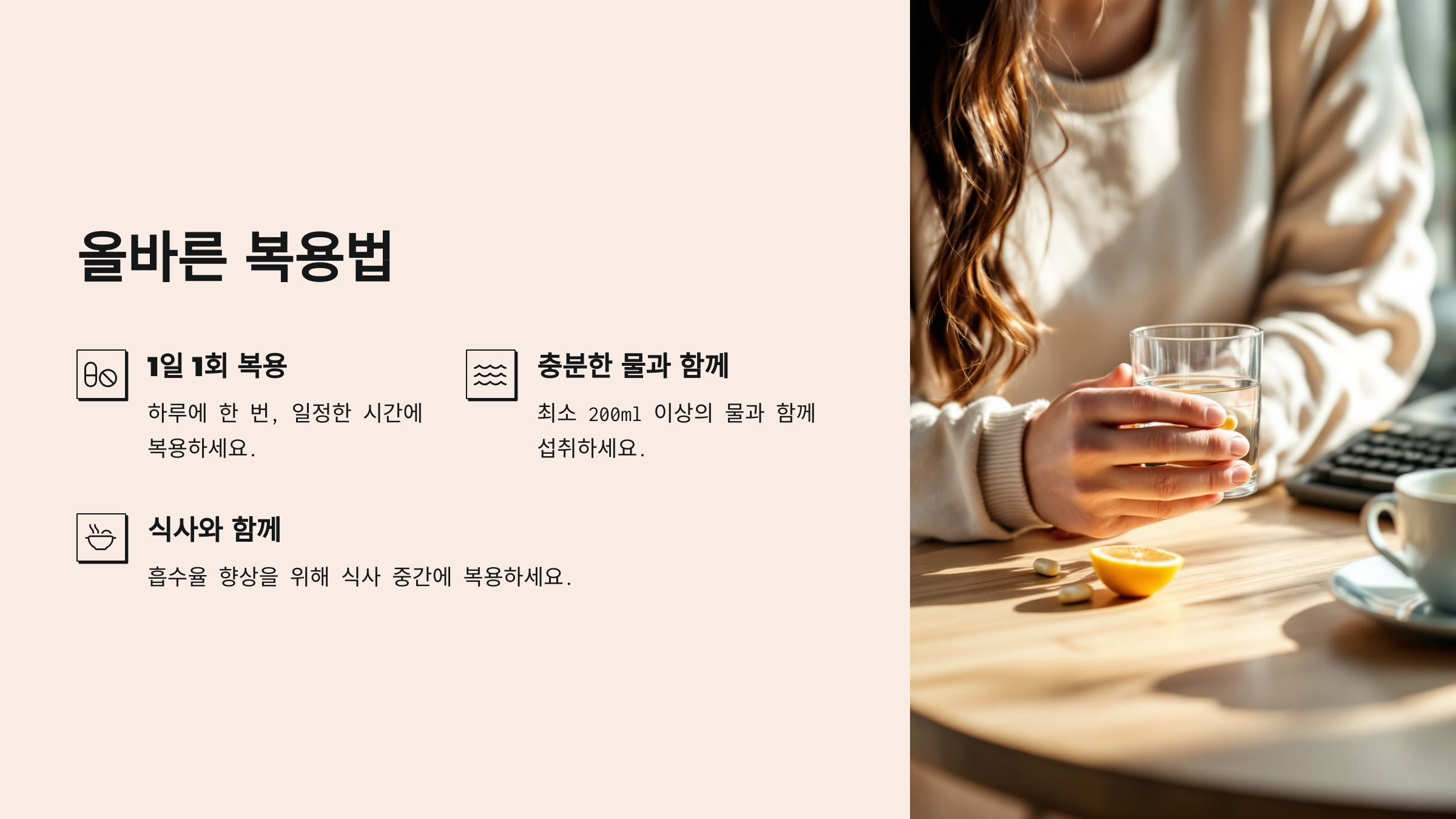 정확한 복용법을 따를수록 체내 흡수율도 높아지고, 효능도 극대화될 수 있어요.