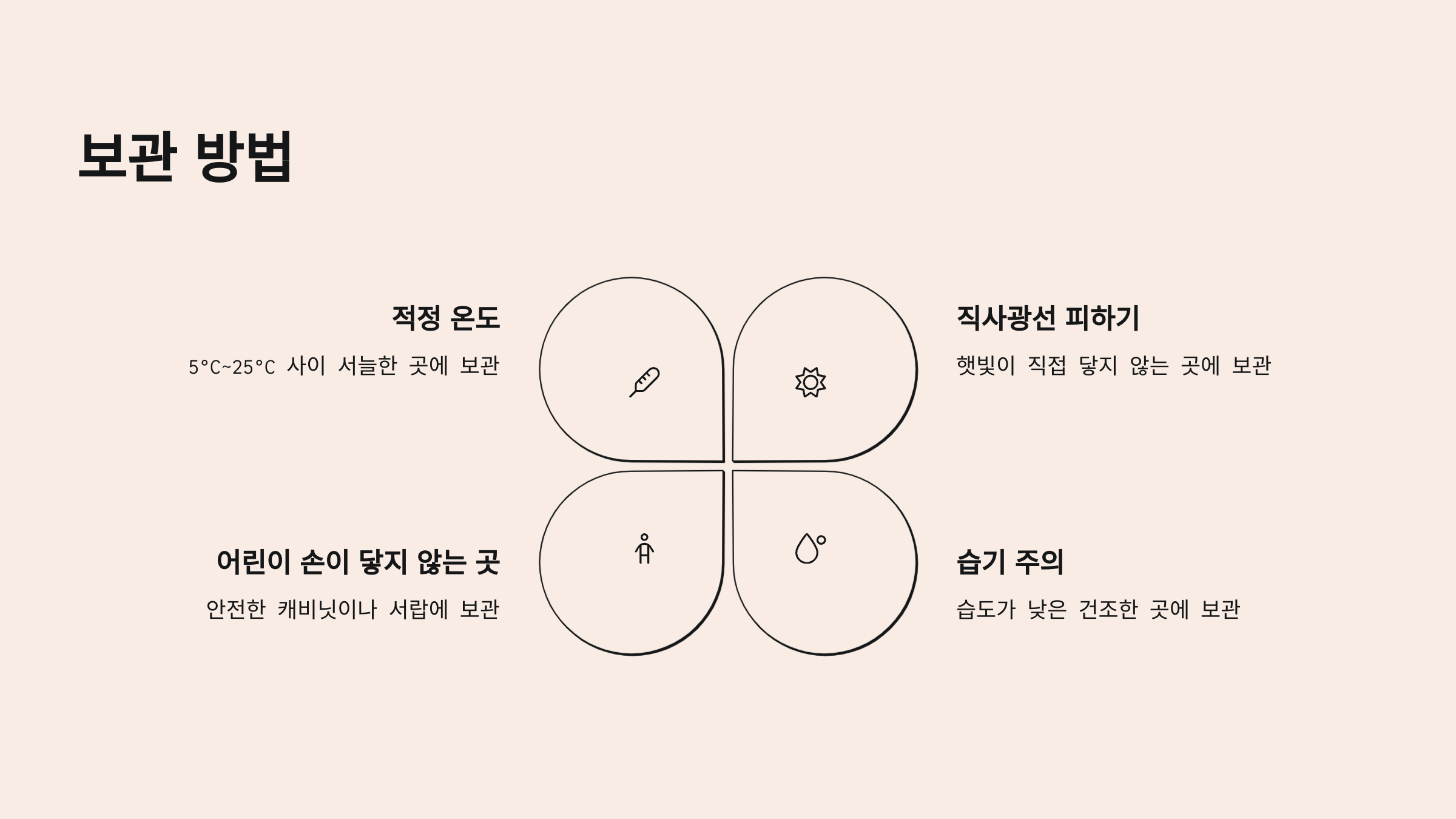 온도 변화가 잦은 곳에 두면 액상이 변질될 수 있고, 정제 역시 습기를 머금을 위험이 크기 때문이에요.
