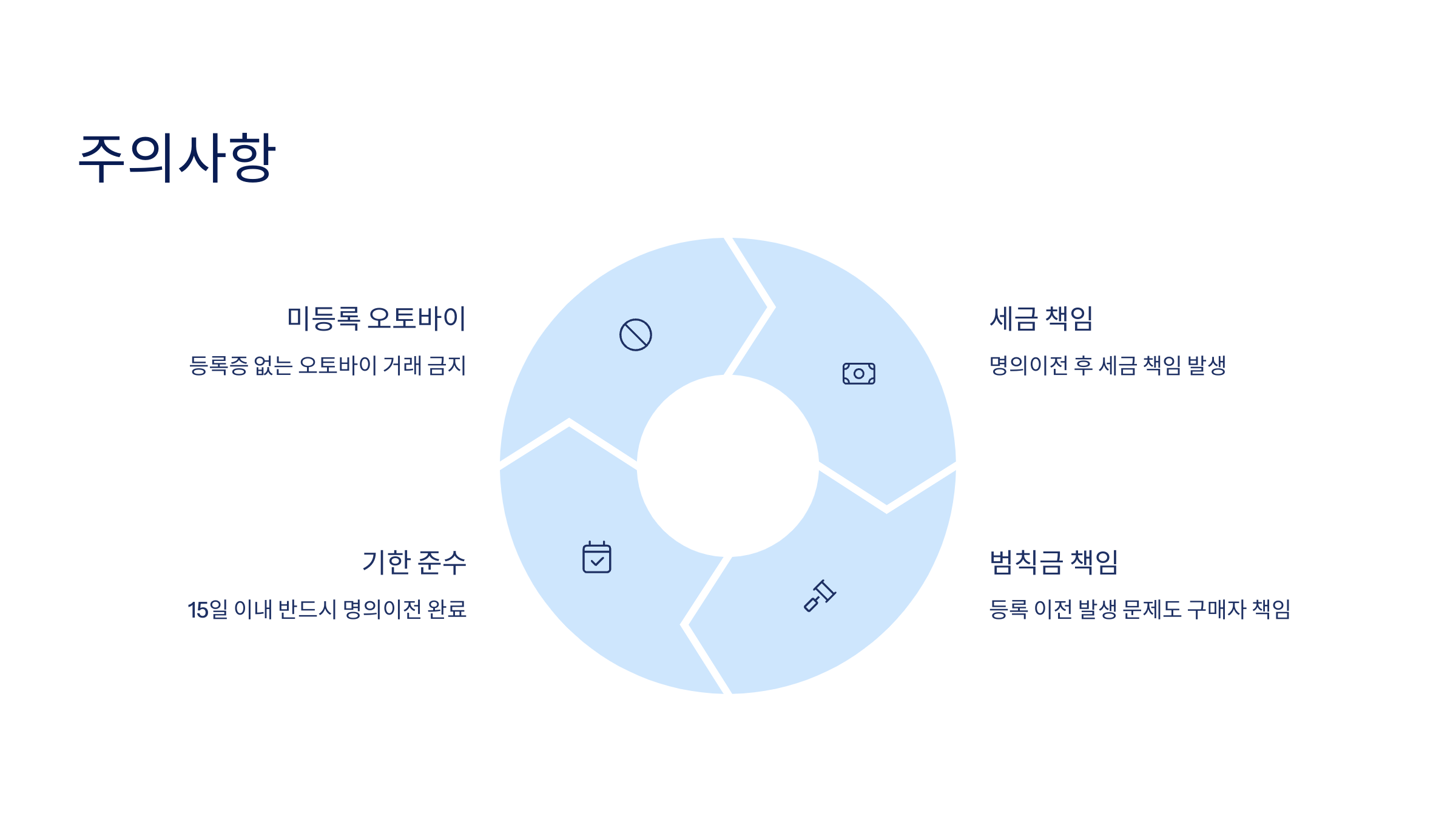 - 명의이전 완료 후 세금, 범칙금 책임: 등록 이전 발생한 문제도 구매자 책임이 될 수 있어요.