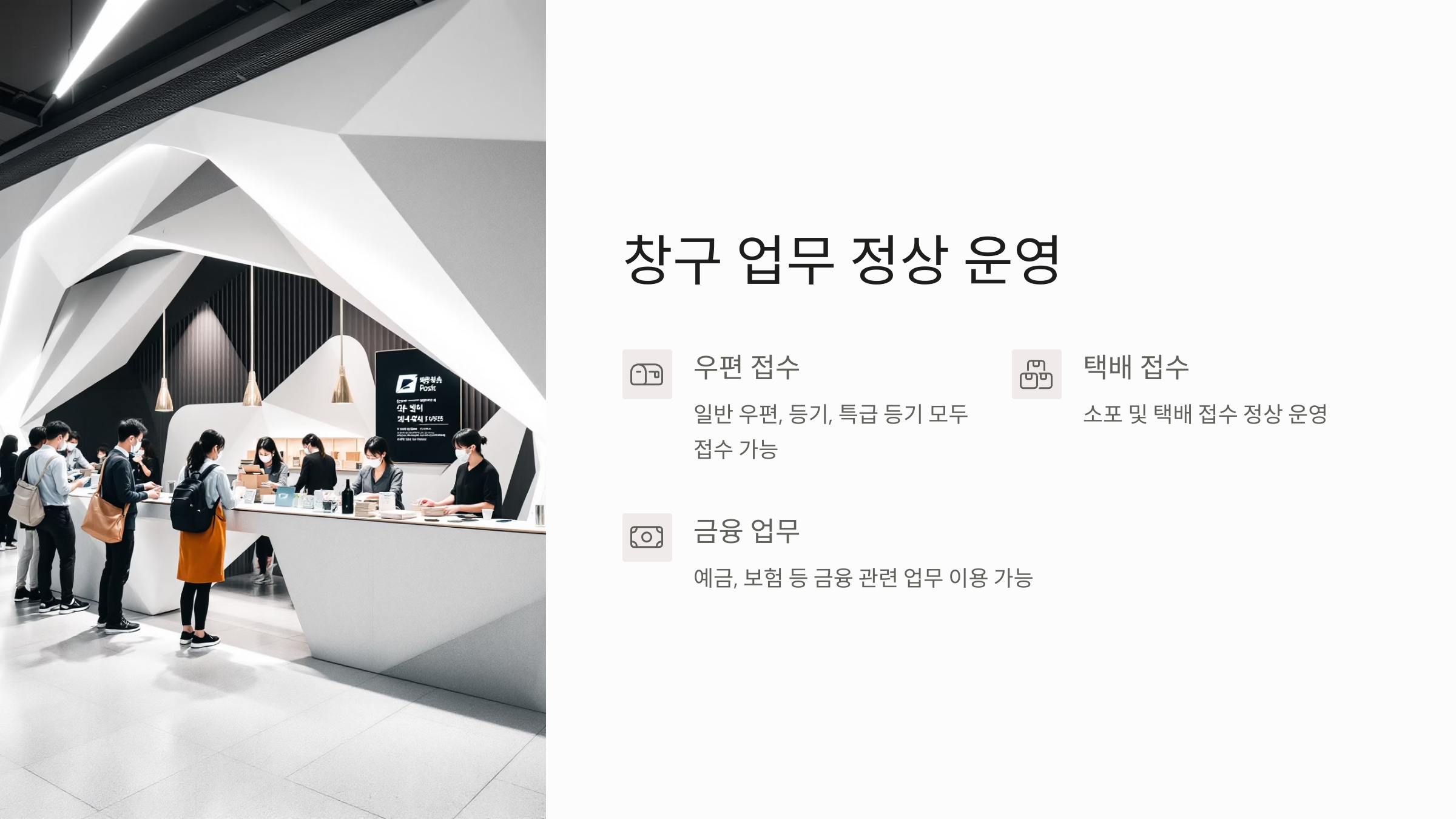 따라서 우편 접수, 택배 접수, 소포 접수뿐만 아니라 예금, 보험 등 금융 관련 업무도 평소처럼 이용할 수 있어요!