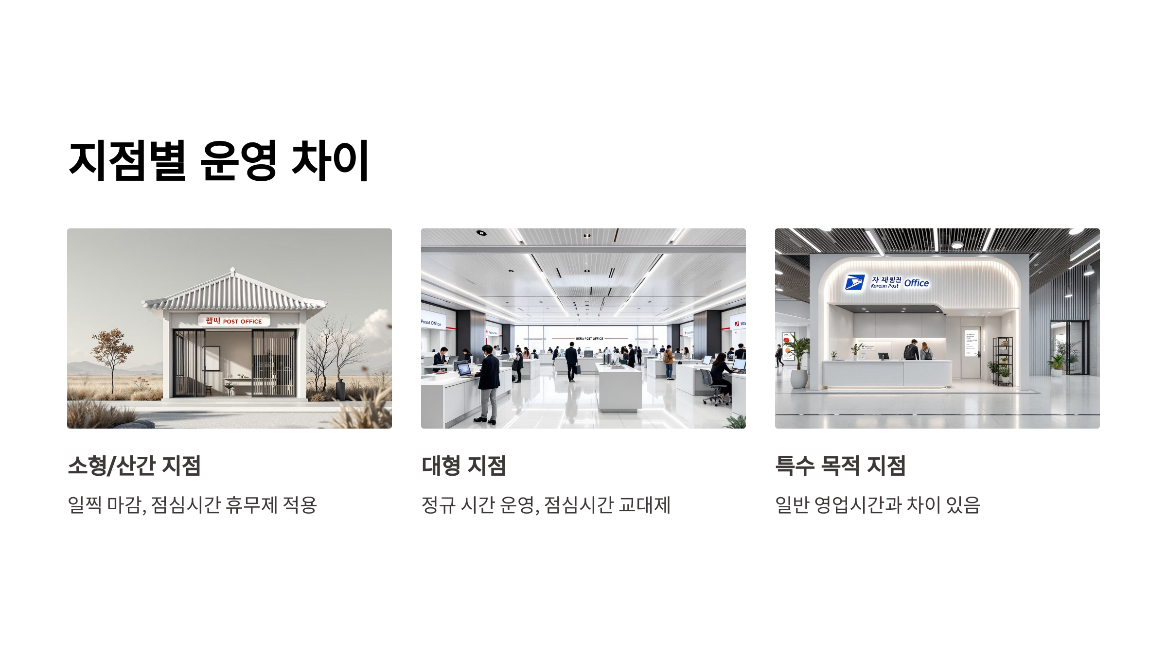 일부 소형 지점이나 산간지역 우체국은 운영시간이 다를 수 있으며, 일찍 문을 닫거나 점심시간 휴무제를 적용하는 경우가 많습니다.