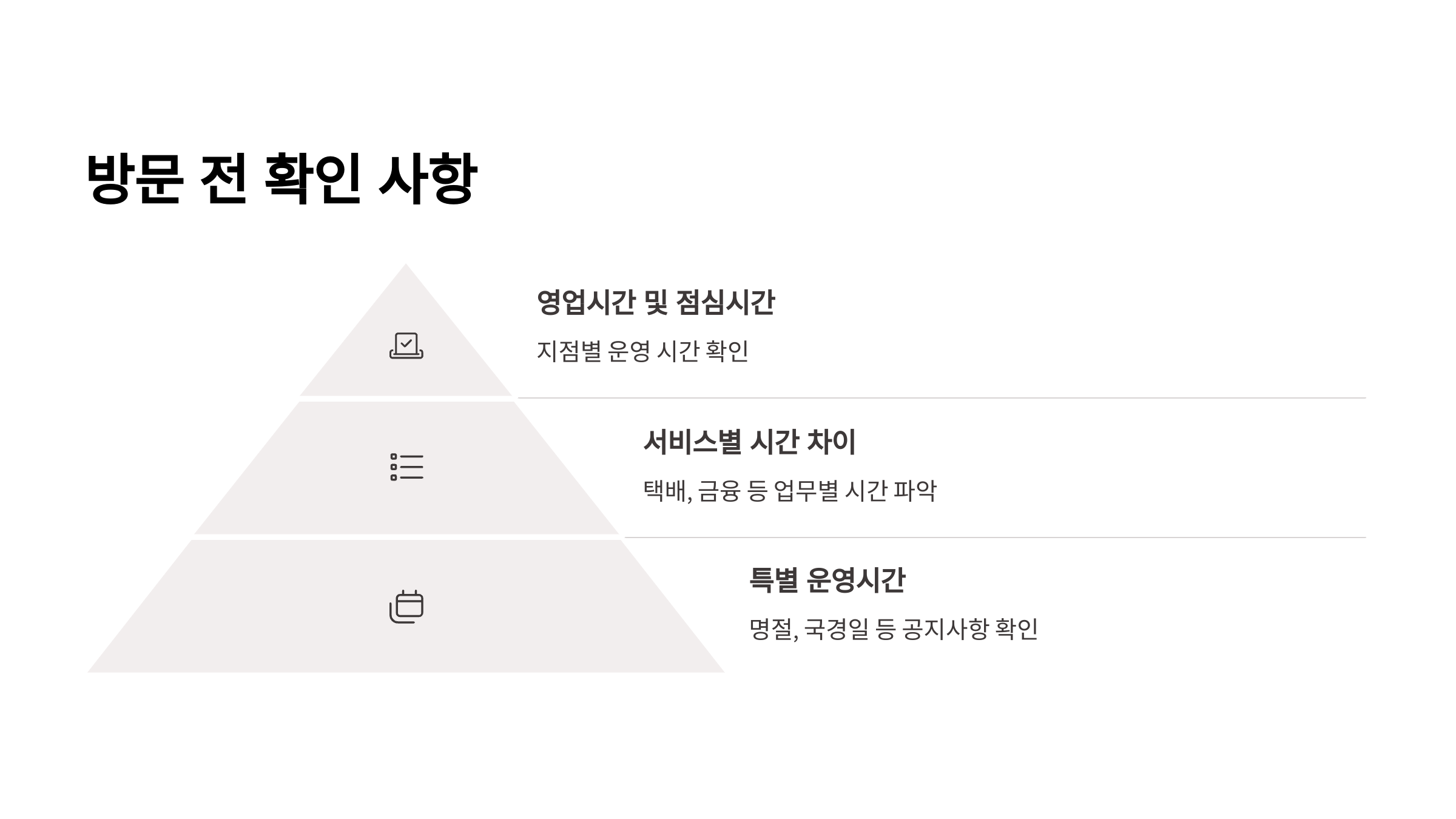또한 일부 특수 목적 우체국(학교 내, 공공기관 내 설치 등)은 일반 영업시간과 차이가 있을 수 있으니 꼭 별도로 체크해야 합니다. 📝