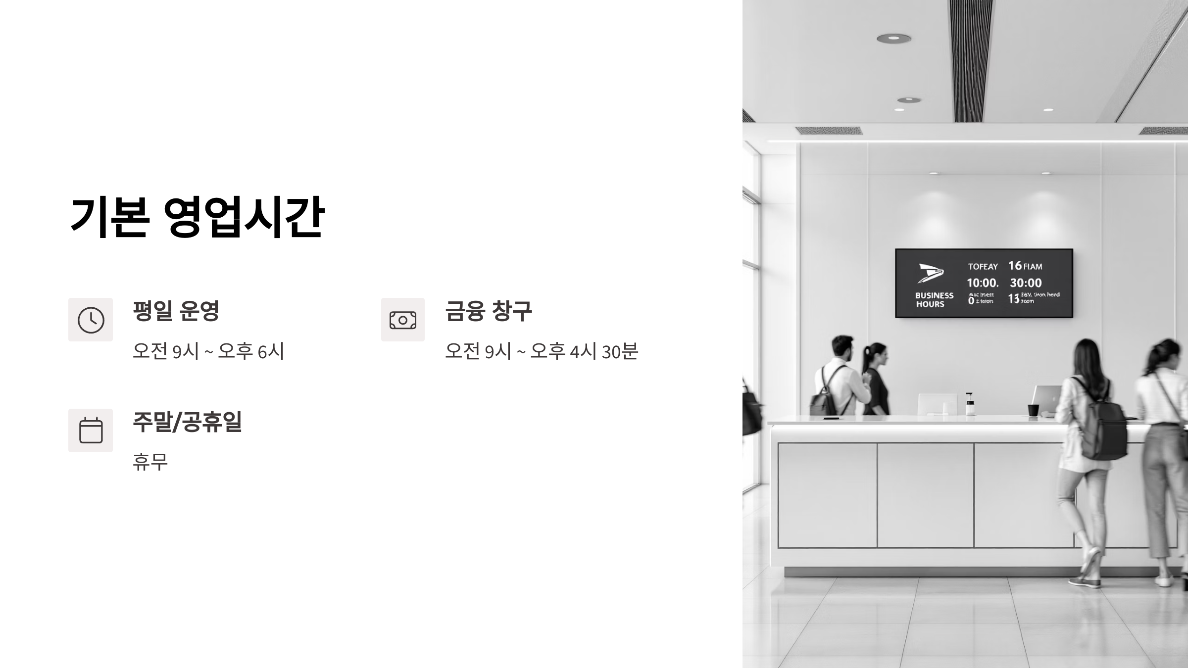 | 금융업무 영업시간 | 평일 09:00 ~ 16:30 |
