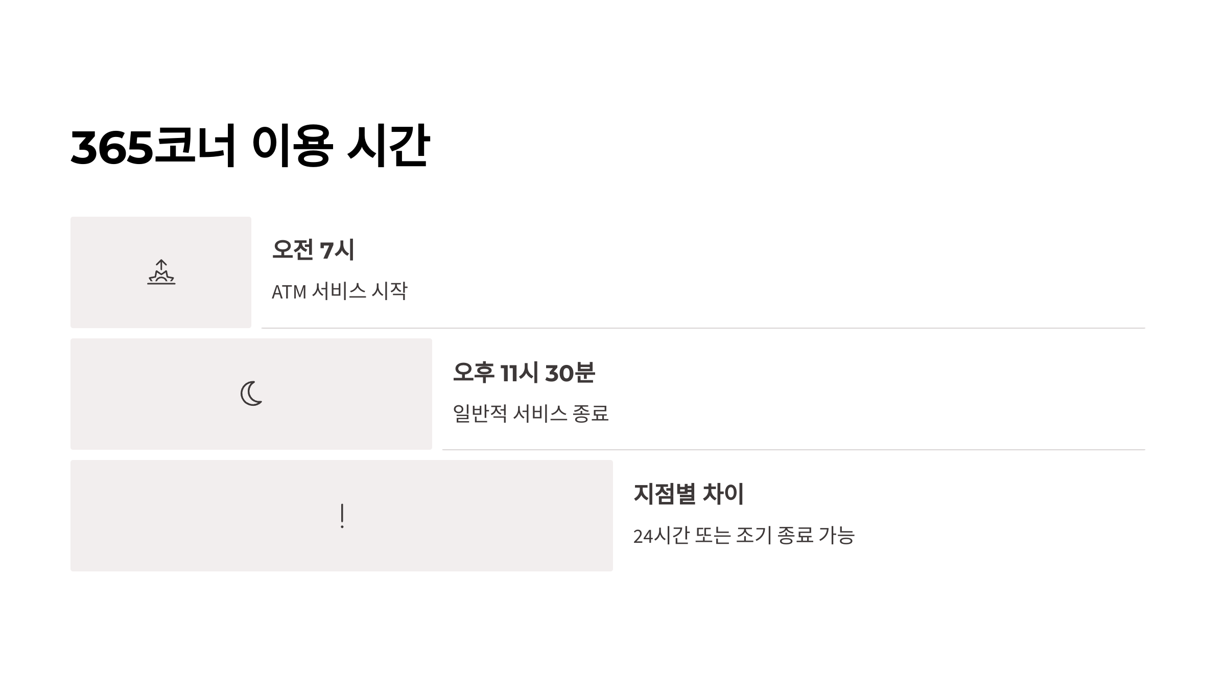 | 점심시간 휴무 | 일부 소형 지점: 12:00~13:00 또는 12:30~13:30 |
