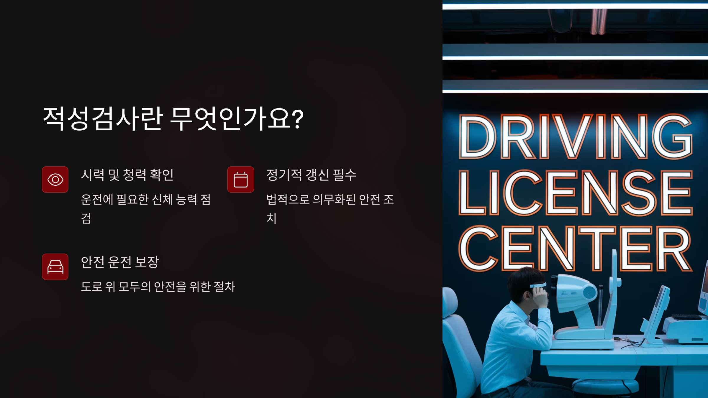 쉽게 말해, “운전할 수 있는 상태인지 검사하는 정기 건강검진”이라고 보면 이해가 쉬워요.
