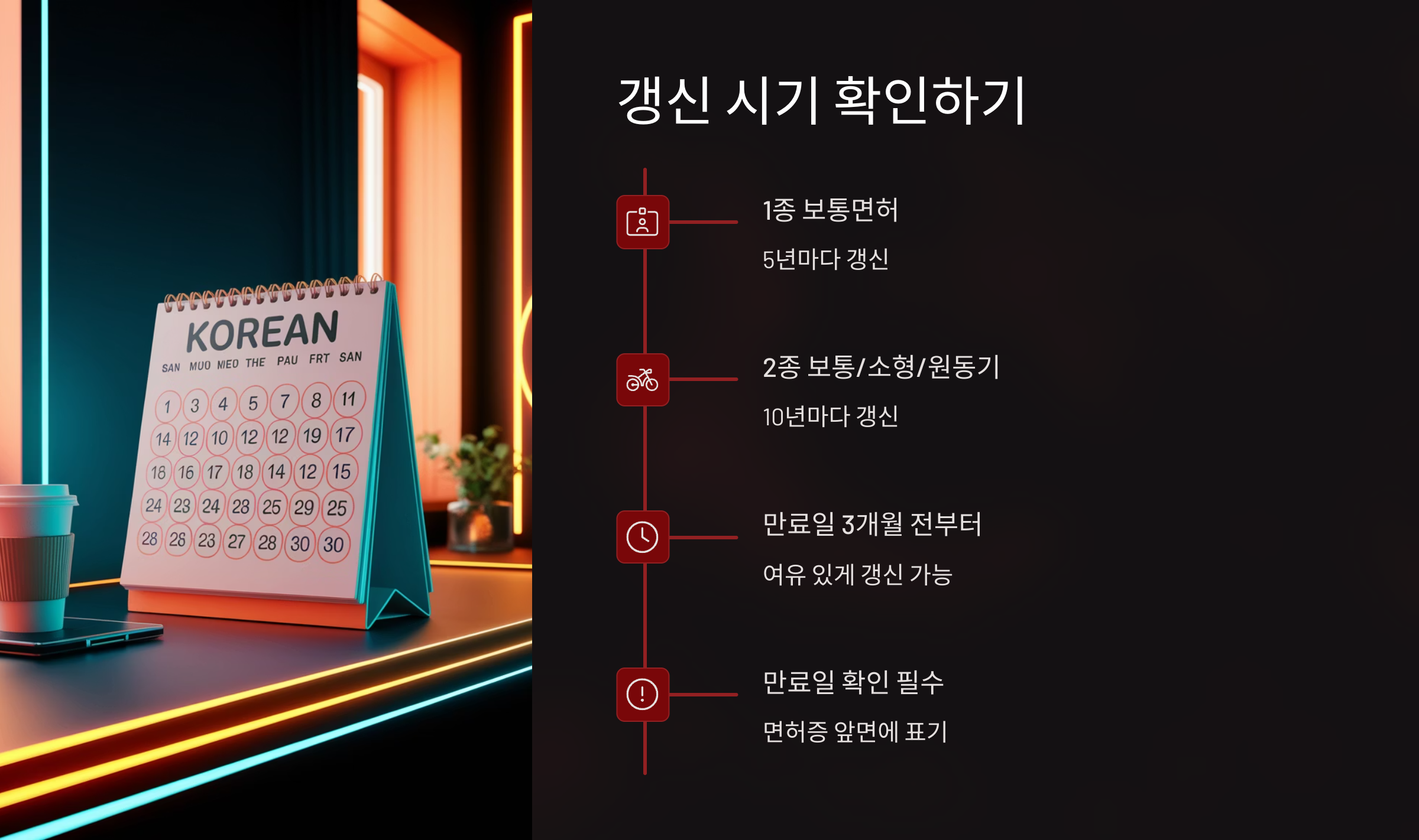 면허증에 적힌 ‘갱신 기간’은 보통 유효기간 시작일 기준으로 6개월 전부터 갱신이 가능하며, 유효기간 만료일 전까지 꼭 완료해야 합니다.