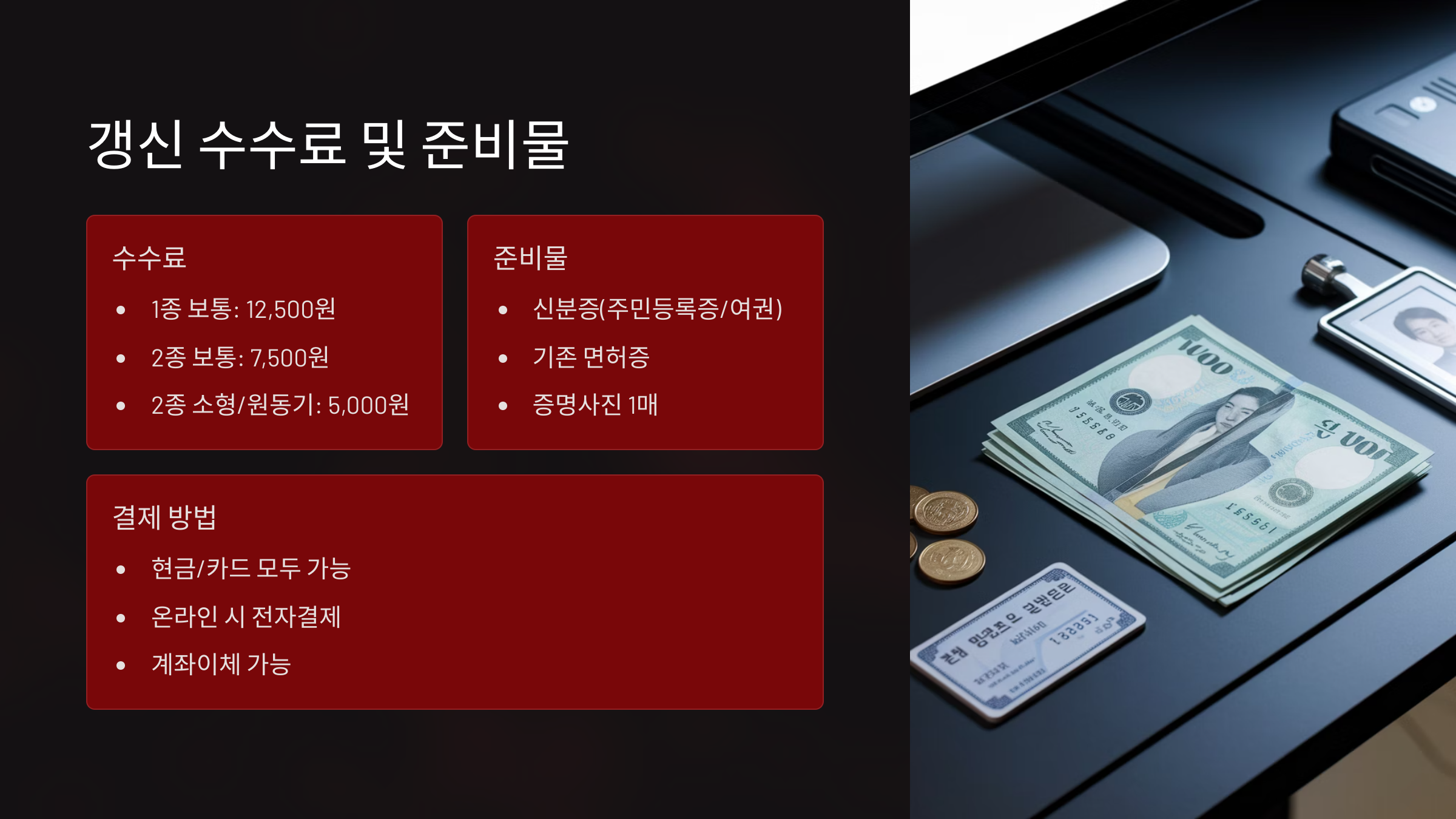 🔖 체크포인트 4: 사진, 수수료, 신분증 미리 준비하고 갱신 신청하세요.