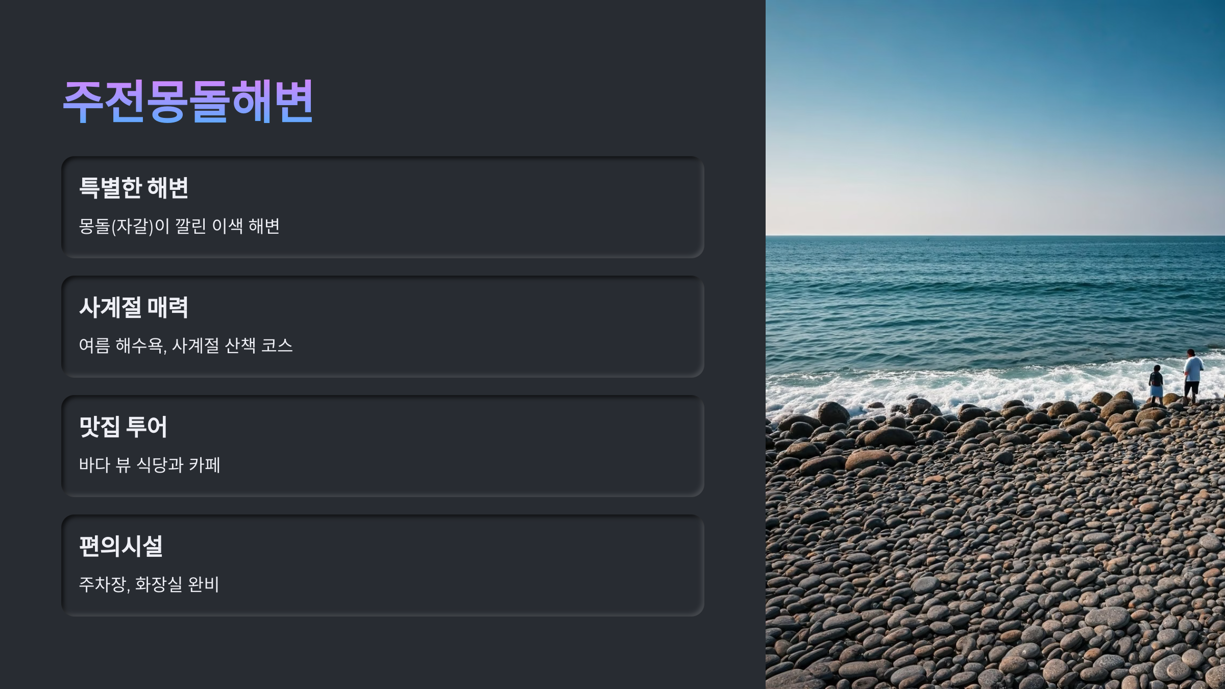 주전몽돌해변은 이름 그대로 몽돌(자갈)이 깔린 특별한 해변이에요.