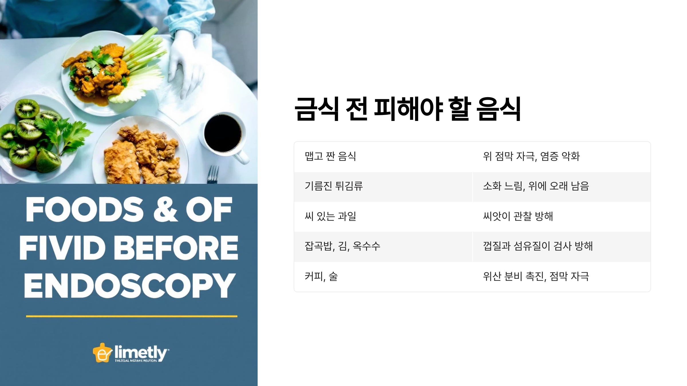💡 TIP: 검사 전에는 부드럽고 소화가 잘 되는 음식(예: 흰죽, 흰밥, 두부 등)을 소량 섭취하는 것이 좋아요!