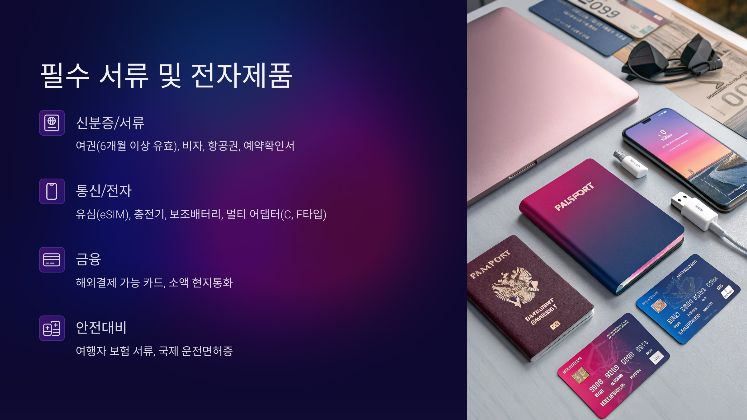 | 신분증/서류 | 여권, 항공권, 예약서, 보험서류, 국제운전면허증 |