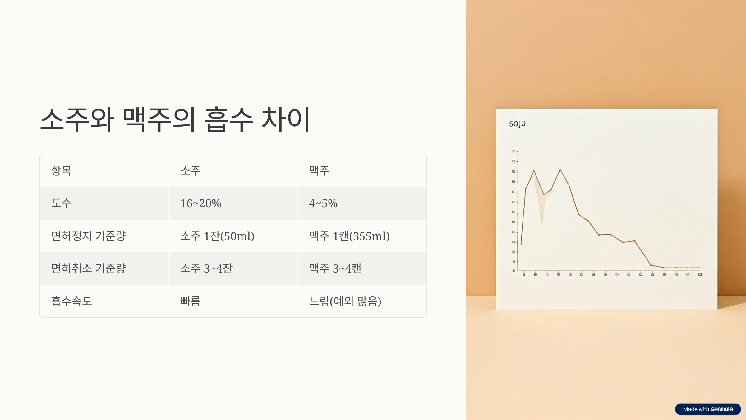 같은 양을 마셔도 소주와 맥주는 체내에서 흡수되는 방식과 속도에 따라 혈중알코올농도에 미치는 영향이 다릅니다.