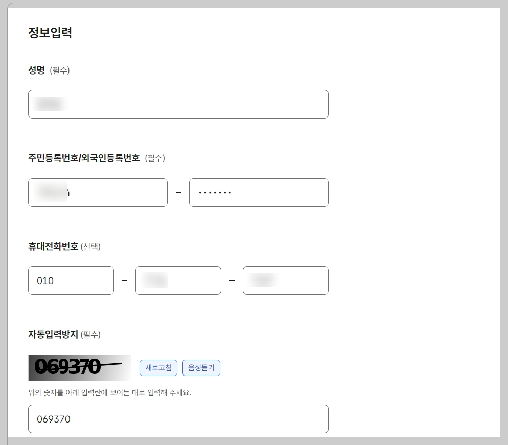 11.전화번호 인증을 하고 아래를 작성한 후 신청하기를 누릅니다.