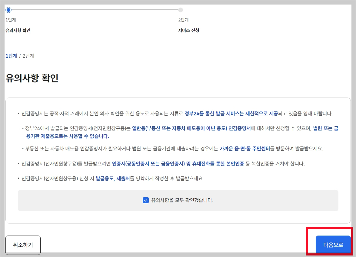 8. 유의사항 체크를 하고 다음으로 갑니다.