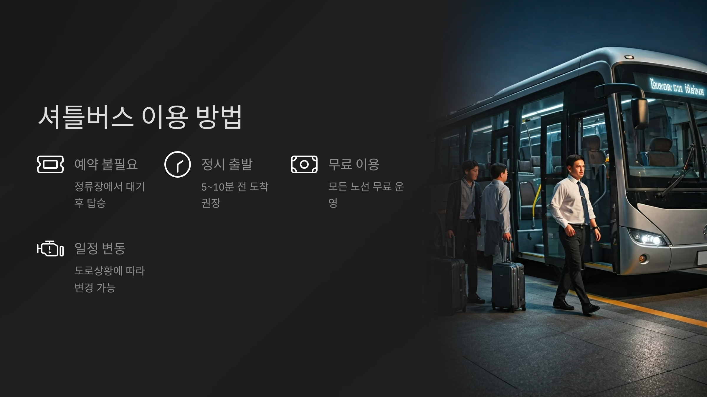 🔖 정시 탑승 필수: 셔틀은 정해진 시간에 출발하니 여유 있게 도착하세요.