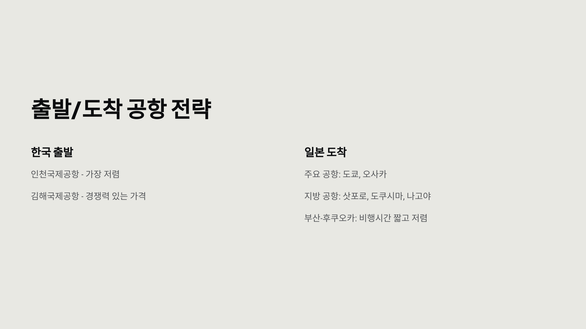 보통 인천공항 출발 + 일본의 지방공항(삿포로, 도쿠시마 등) 도착 조합이 저렴합니다. 부산-후쿠오카 노선도 인기예요.