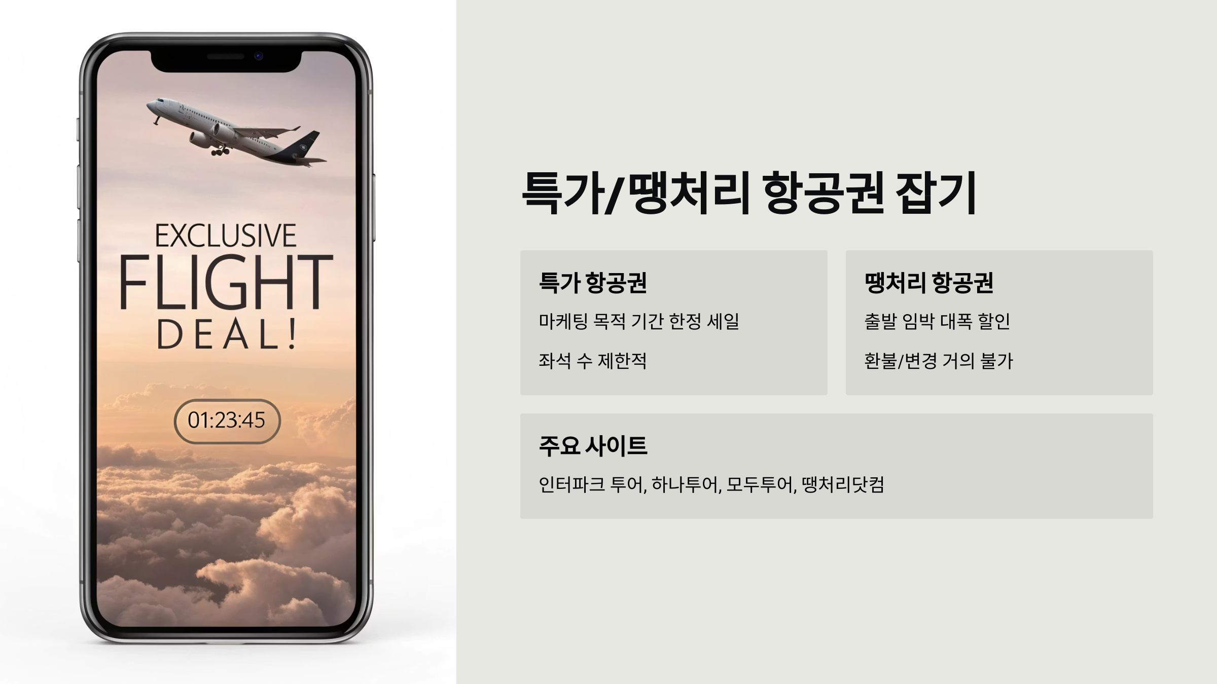 항공권도 타이밍입니다! 특가와 땡처리 항공권은 짧은 시간 내에 매진되기 때문에 빠른 판단이 중요해요.