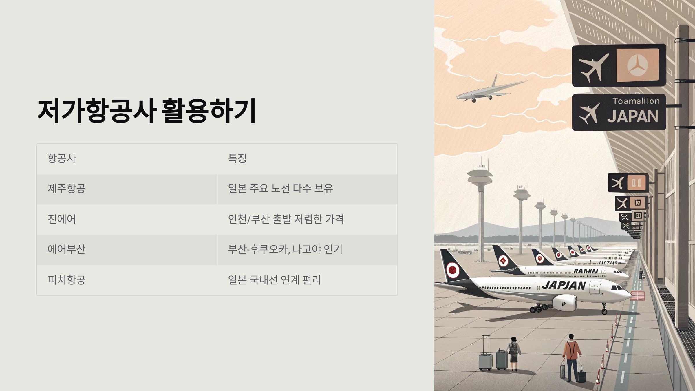 | 제주항공 | 오사카, 도쿄, 나고야 등 일본 주요 노선 보유 |