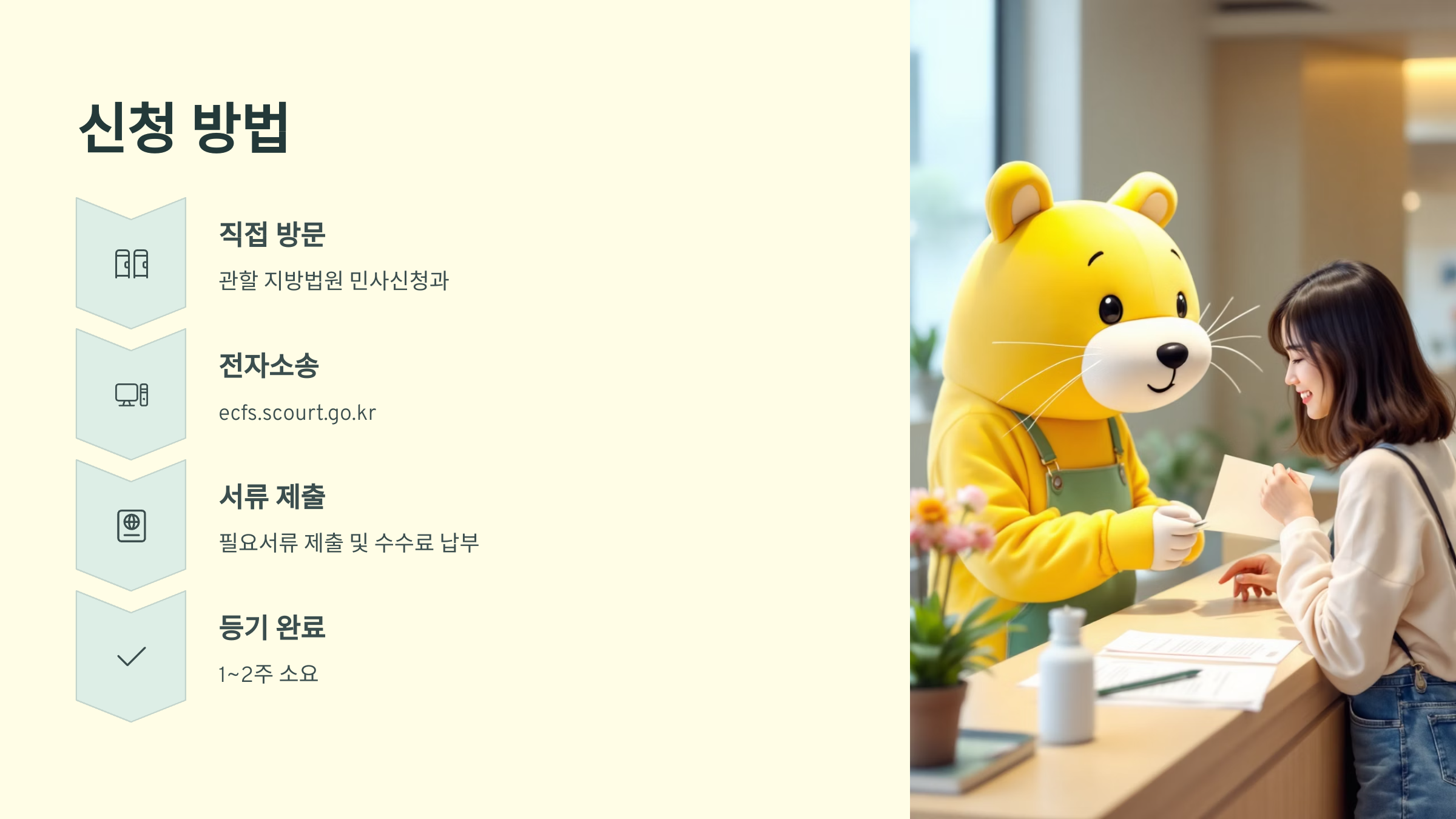 신청 방법은 두 가지예요. 직접 법원에 방문하거나, 전자소송 시스템을 통해 온라인으로 신청할 수 있어요.